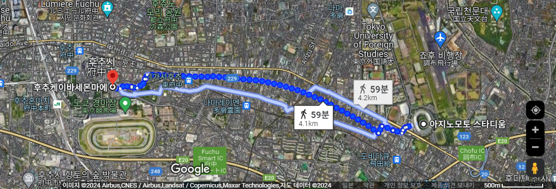 하지만 히가시후츄 역은 급행이나 특급이 서지 않기 때문에, 구글 지도는 후츄(府中) 역에서 내리라고 알려준다. 신주쿠에서 후츄 역까지는 20킬로 정도 되기 때문에, 신주쿠에서 올 때는 이 쪽이 더 빠를 것이다.