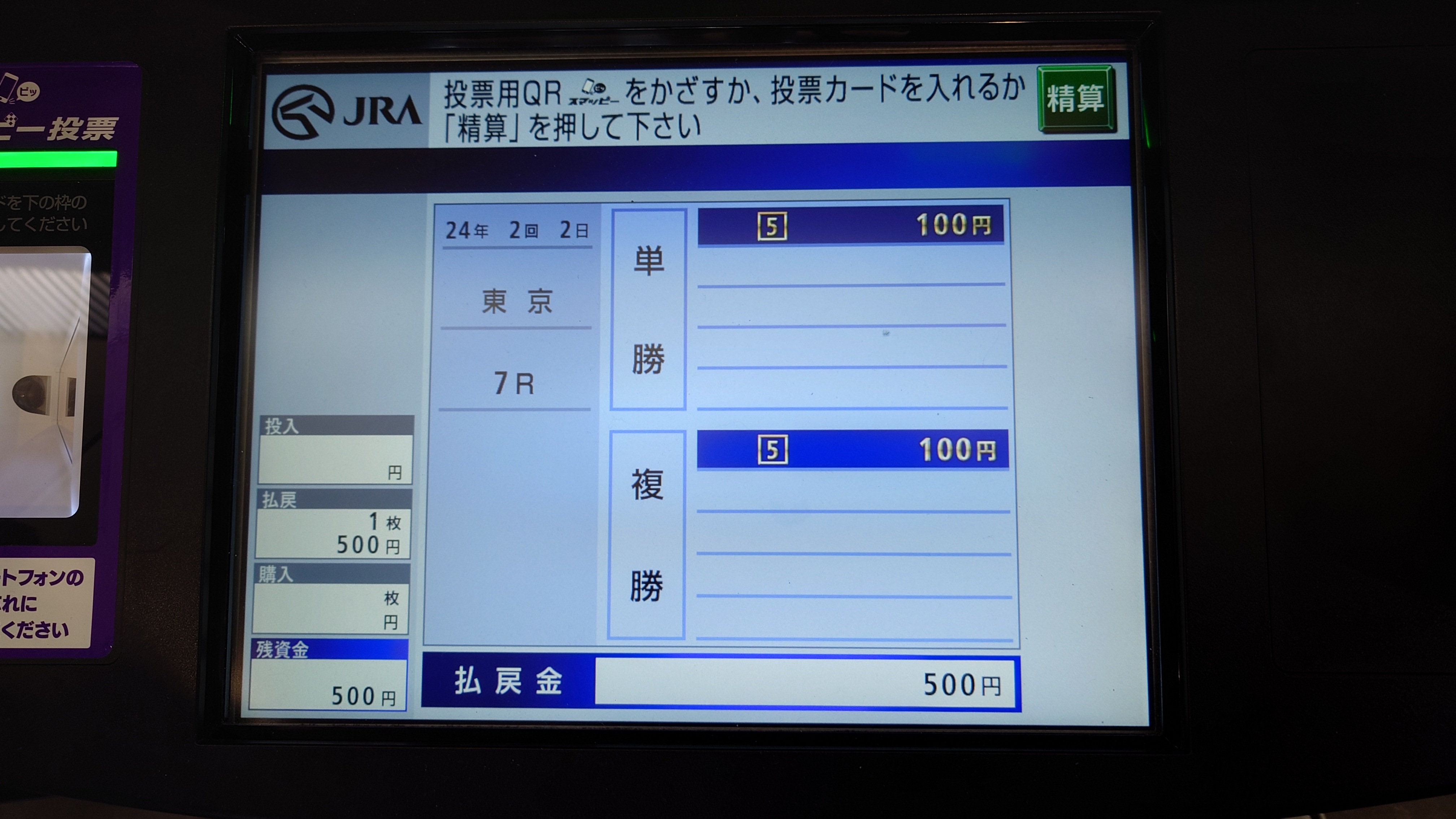 마권 발매기에 OMR카드를 넣어서 단승과 연승에 각각 100엔씩 배팅했음을 보여주고, 오른쪽 위의 정산 버튼을 누르면 마권이 발매된다.