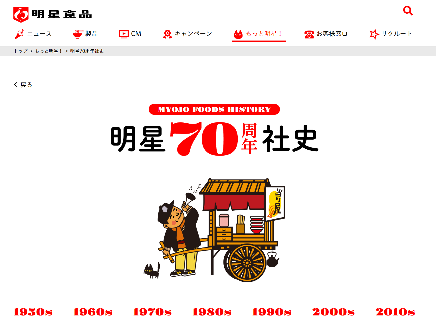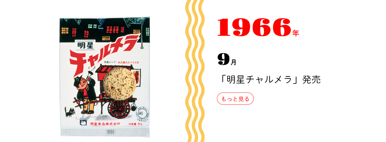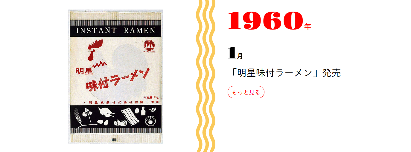 1958년 닛신 식품에서 내놓은 치킨 라멘(チキンラーメン)에 자극받아 인스턴트 라면 개발을 시작, 1960년 묘죠 양념 라면(明星味付けラーメン)을 내놓는다.