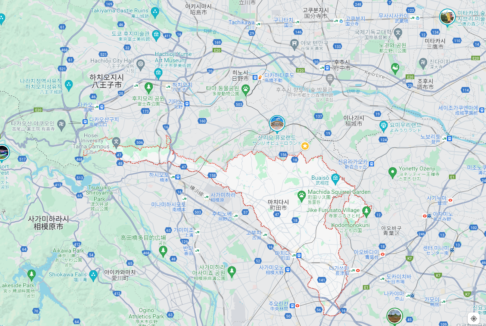 마치다 시는 하치오지 시(八王子市)남쪽이라는 이미지만 있었는데, 지도를 보니 타마 시와 이나기 시를 모두 위에 둘 정도로 동서로 긴 지역이었다.