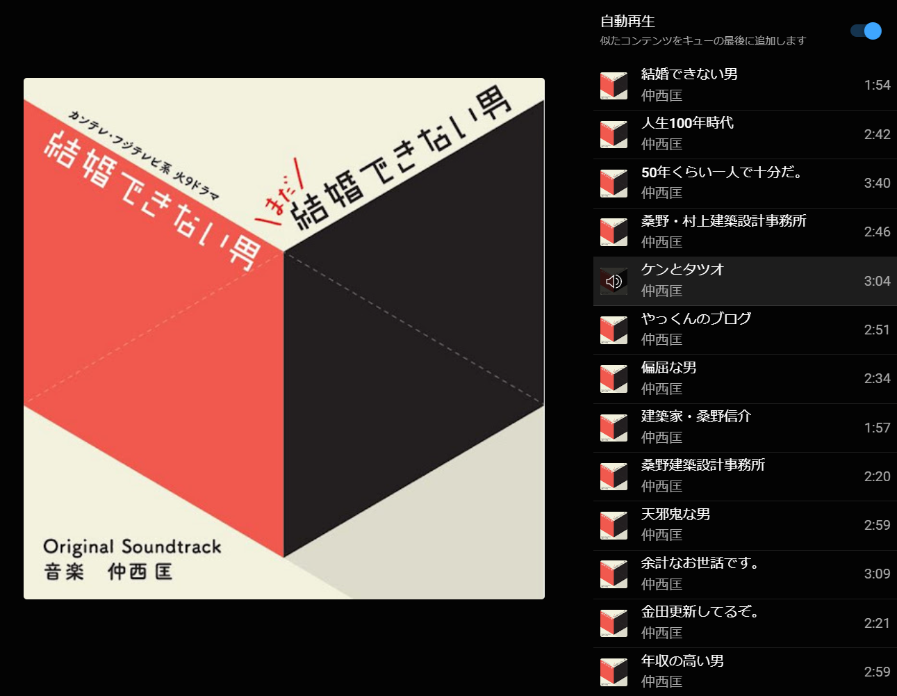 드라마 첫 장면부터 나오는 휘파람 소리의 그 곡은 곡명이 '결혼 못하는 남자' 였다. 배경이 초여름이라 드라마에서는 시종일관 약간 습하고 더운 분위기가 흐르지만, 청량한 어쿠스틱 기타 선율과 휘파람이 이루는 하모니에 기분은 마치 남국의 어딘가에 있는 듯한 기분이다. 악기가 클래식이라서 톤은 다르지만 일상물 특유의 완급조절은 아즈망가 대왕 OST가 떠오르기도 한다.