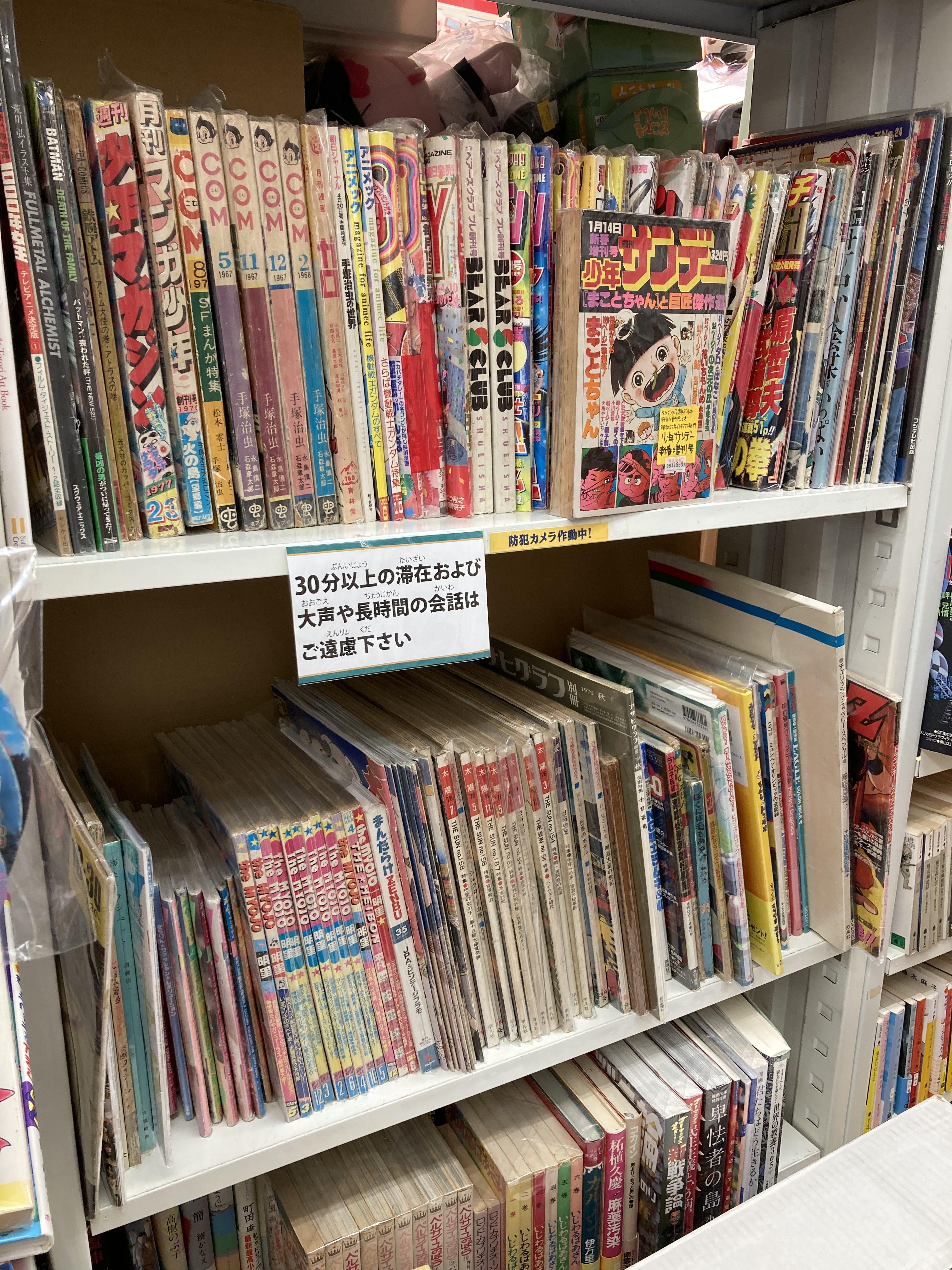 오래된 만화잡지들. 서가에는 '30분 이상 죽치고 있거나 큰 소리로 떠들지 마시오' 라는 문구가 써붙여 있었다.
