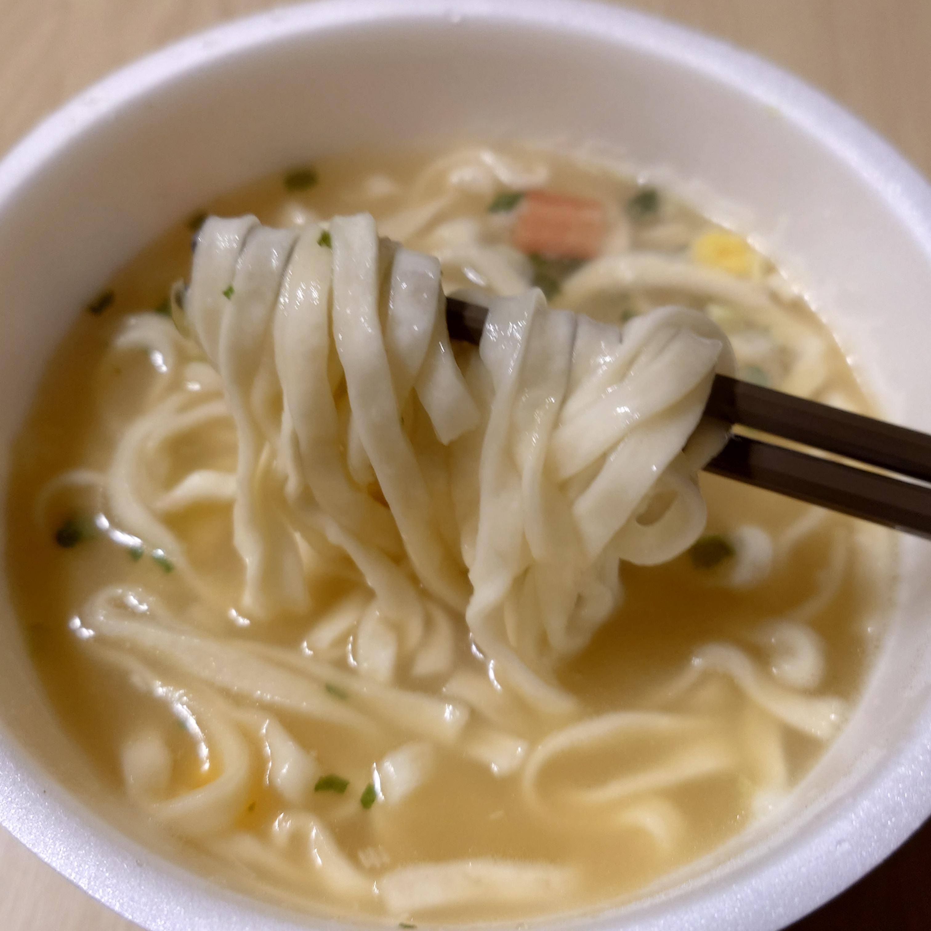 국물이 그냥 시푸드맛이다. 그런데 짜지 않다! 모체가 되는 키츠네 우동 역시 베이스 스프가 컵누들처럼 꽤 짠 편인데 여기도 마찬가지로 베이스의 짠맛이 많이 완화되어 천천히 국물을 다 먹을 수 있었다. U.F.O와 마찬가지로 한 끼로 먹기에는 좀 짠 편인 모체가 시푸드의 크림스프 비슷한 맛으로 덮어져 전체적으로 마일드한 라면이 됐다.