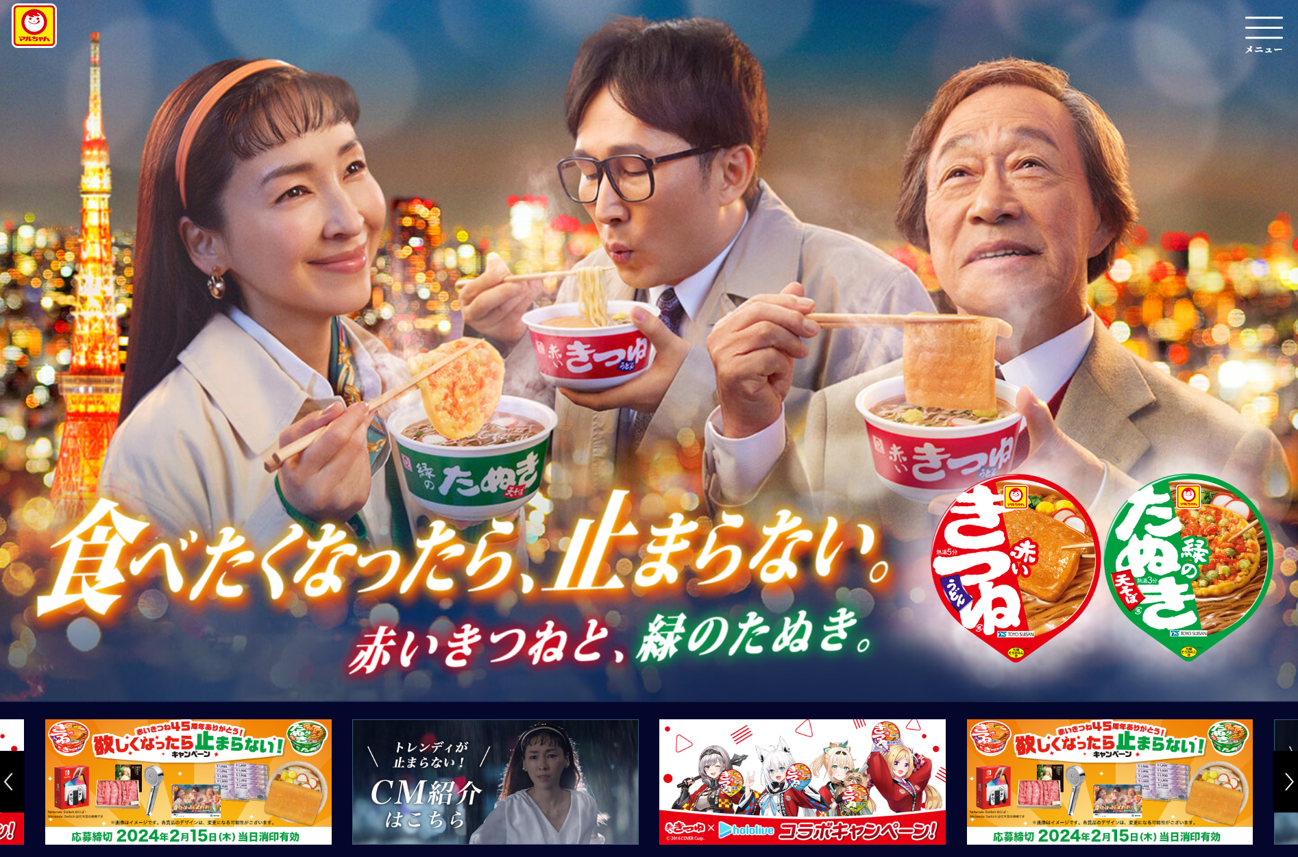 마루쨩의 컵 키츠네 우동(カップきつねうどん)이 1985년 발매. '컵 키츠네 우동'이 '아카이 키츠네 우동'의 전신이며 전통적인 우동사발 모양의 컵라면이 거의 없을 시절 인기에 불을 붙였다고 힘주어 써놓고 있다. 하지만 75년의 사진에는 보통 컵랴면 모양의 '키츠네 우동'과 우동사발이라 보기에는 조금 애매한 '컵 우동' 의 2가지만 있다.
