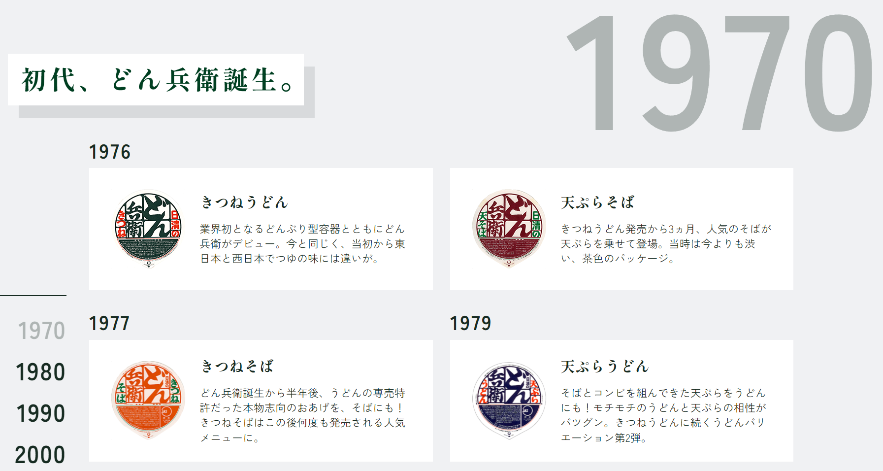 그리고 아카이 키츠네 우동이 1978년, 미도리노 타누키 소바가 1980년에 나왔다.