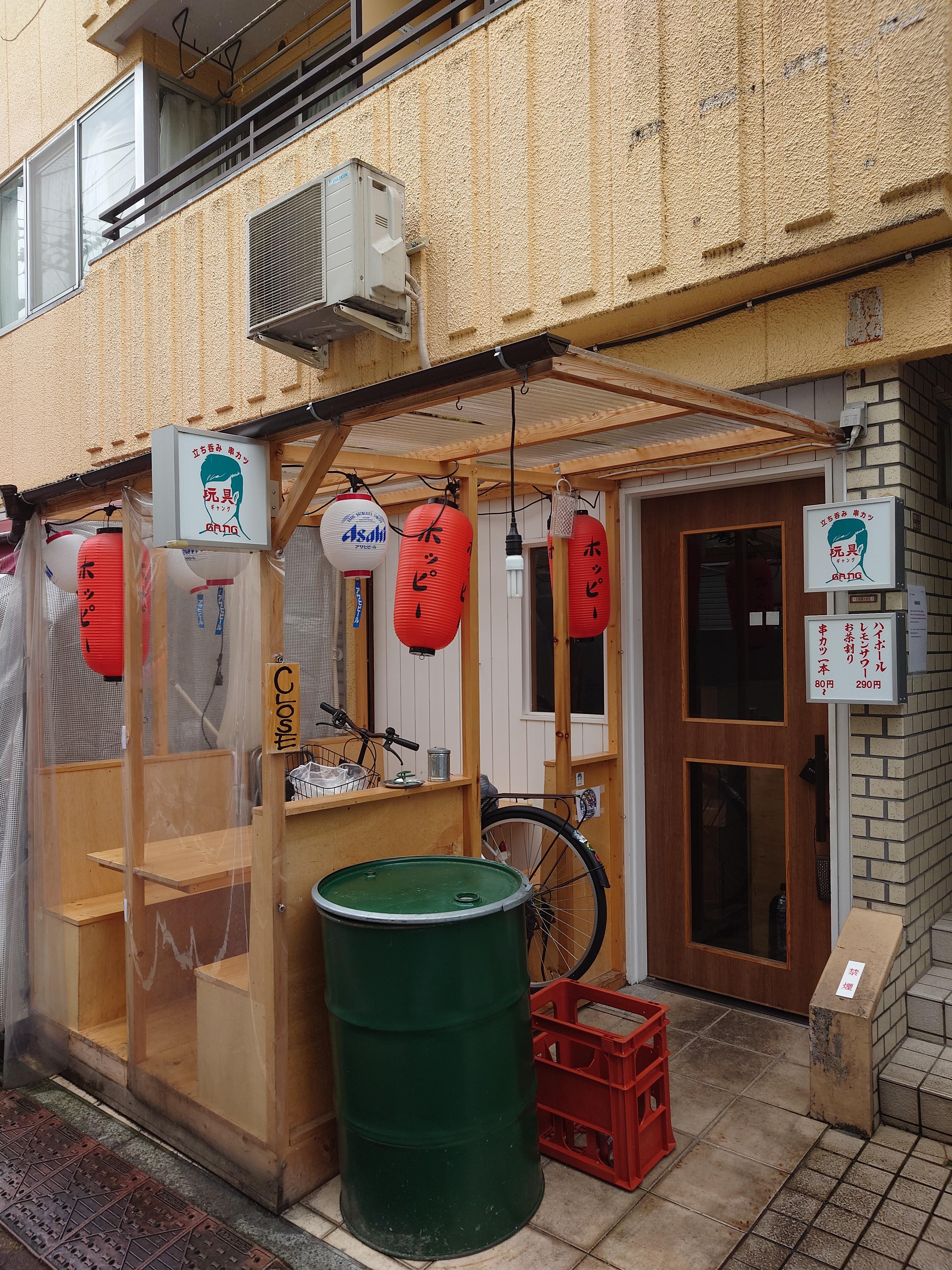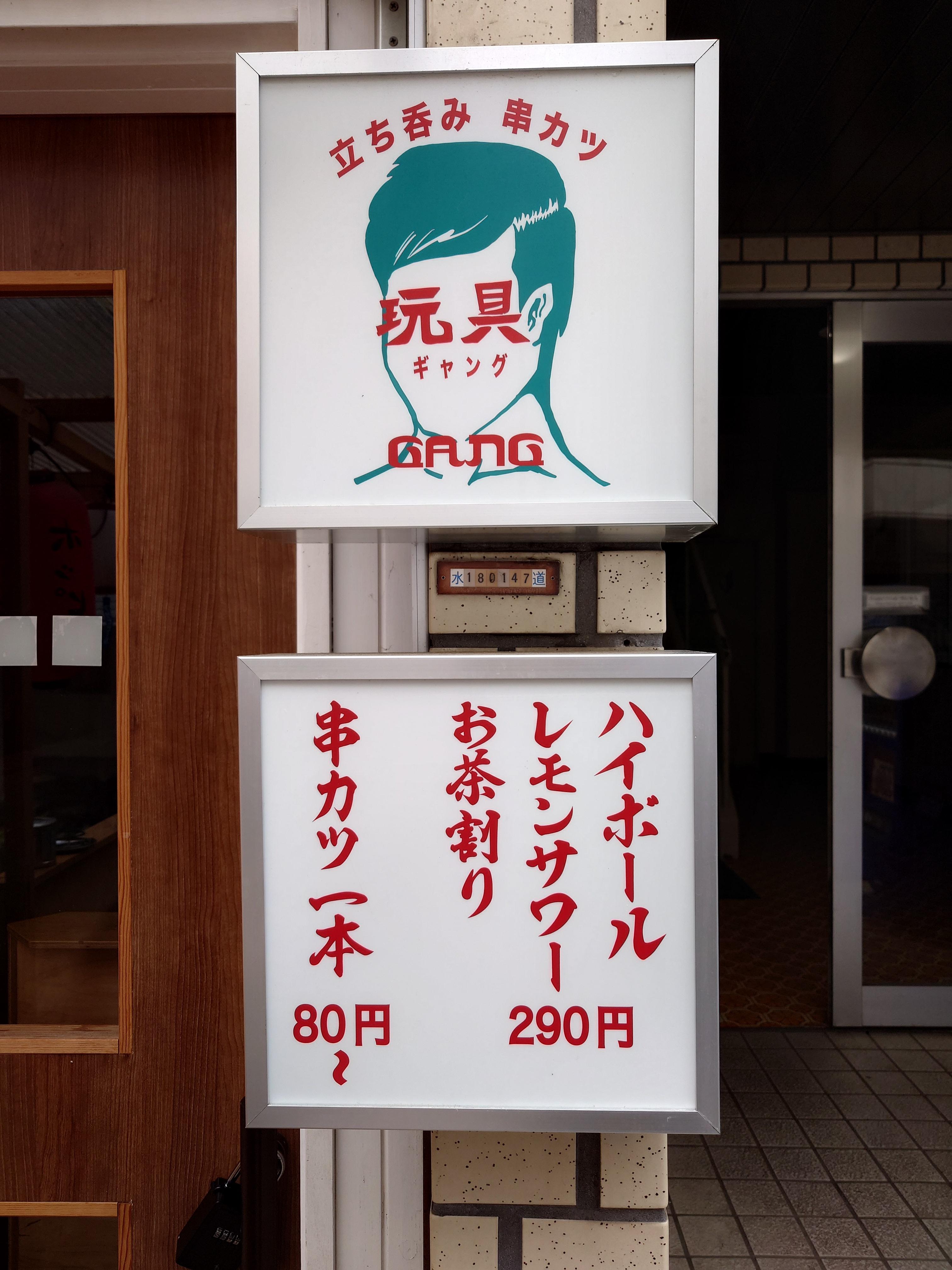 상점가 골목으로 꺾어들어오자 보이는 타치노미 쿠시카츠 완구(立ち飲み串カツ玩具). 玩具의 읽기를 조금 비틀어서 ギャング라고 쓰고 있었다. 그러니까 갱.