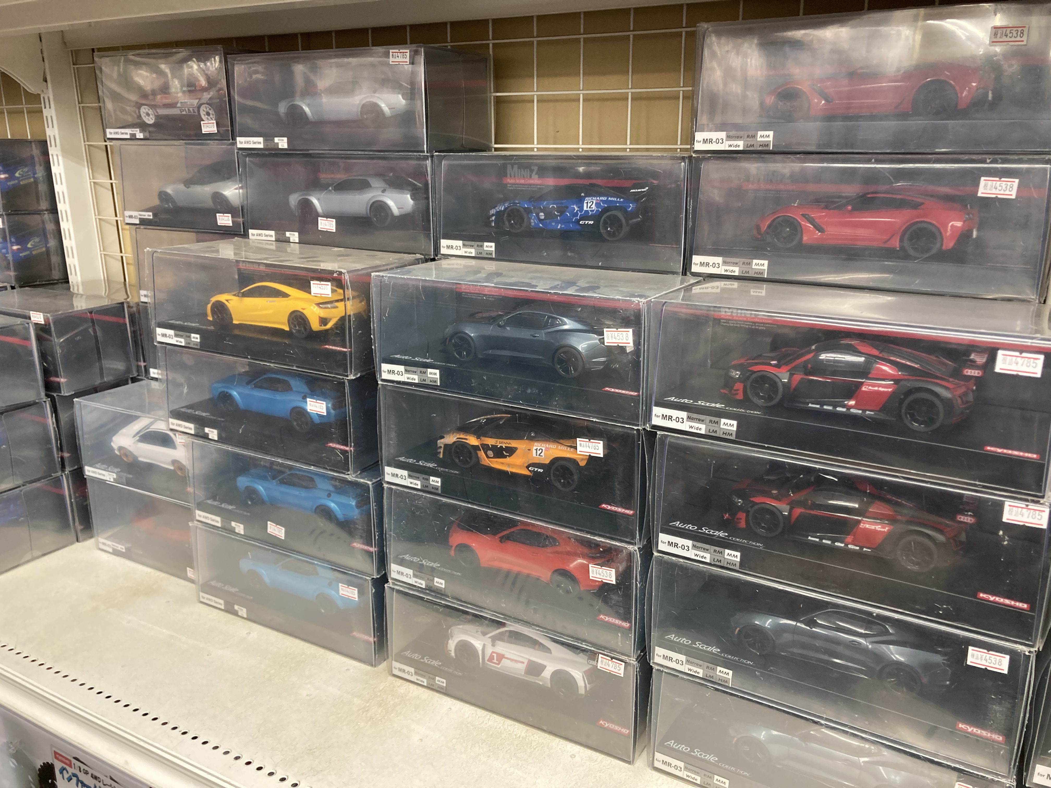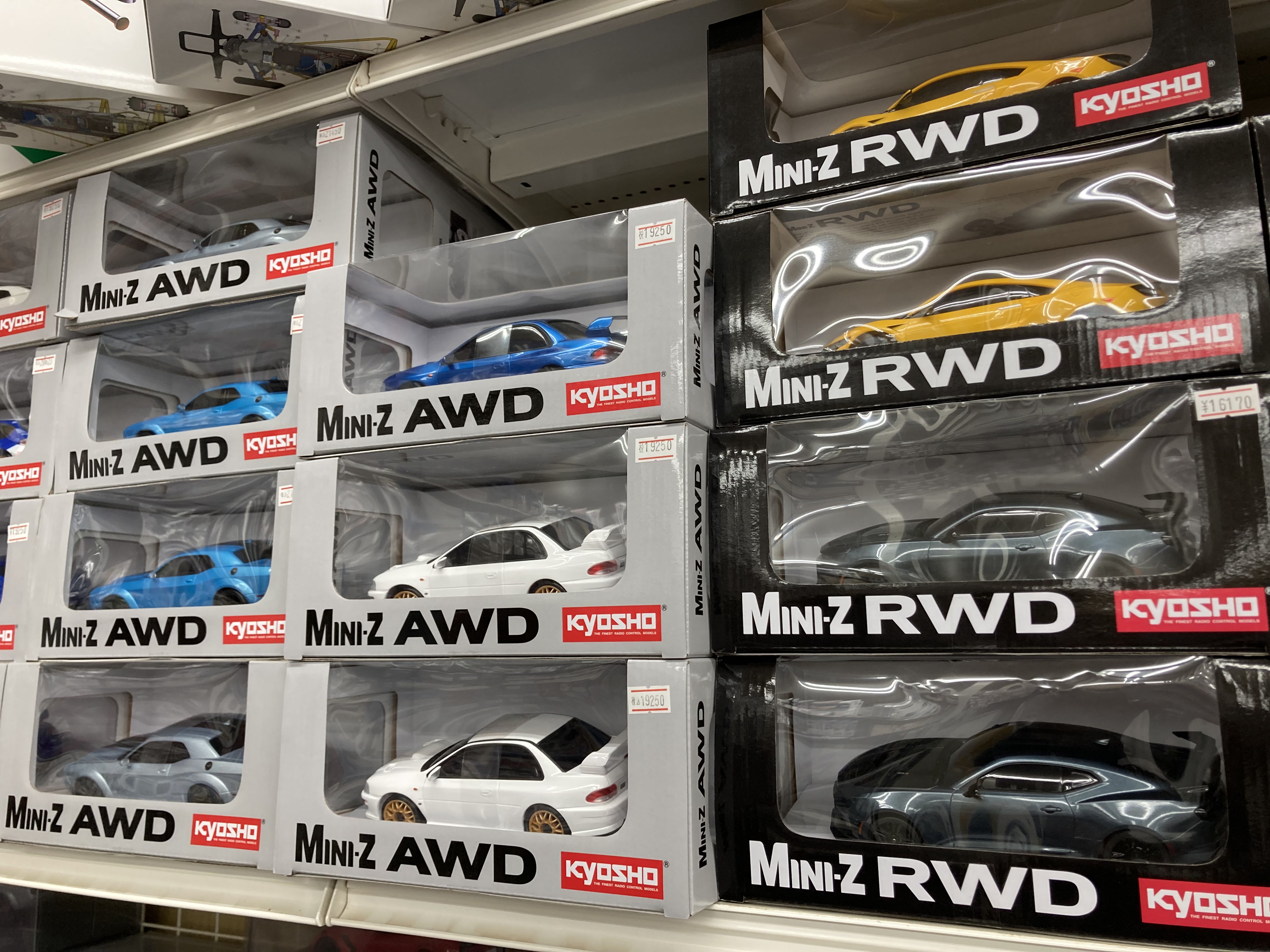 아까 들어올 때 봤던 교쇼 미니지(MINI-Z)자동차들. 송신기 포함해서 15000엔~ 20000엔 선이었다. 참고로 미니지는 카타카나로 ミニッツ (미닛츠)라고 읽기 때문에 검색이나 문의 시에 참고하시기를.