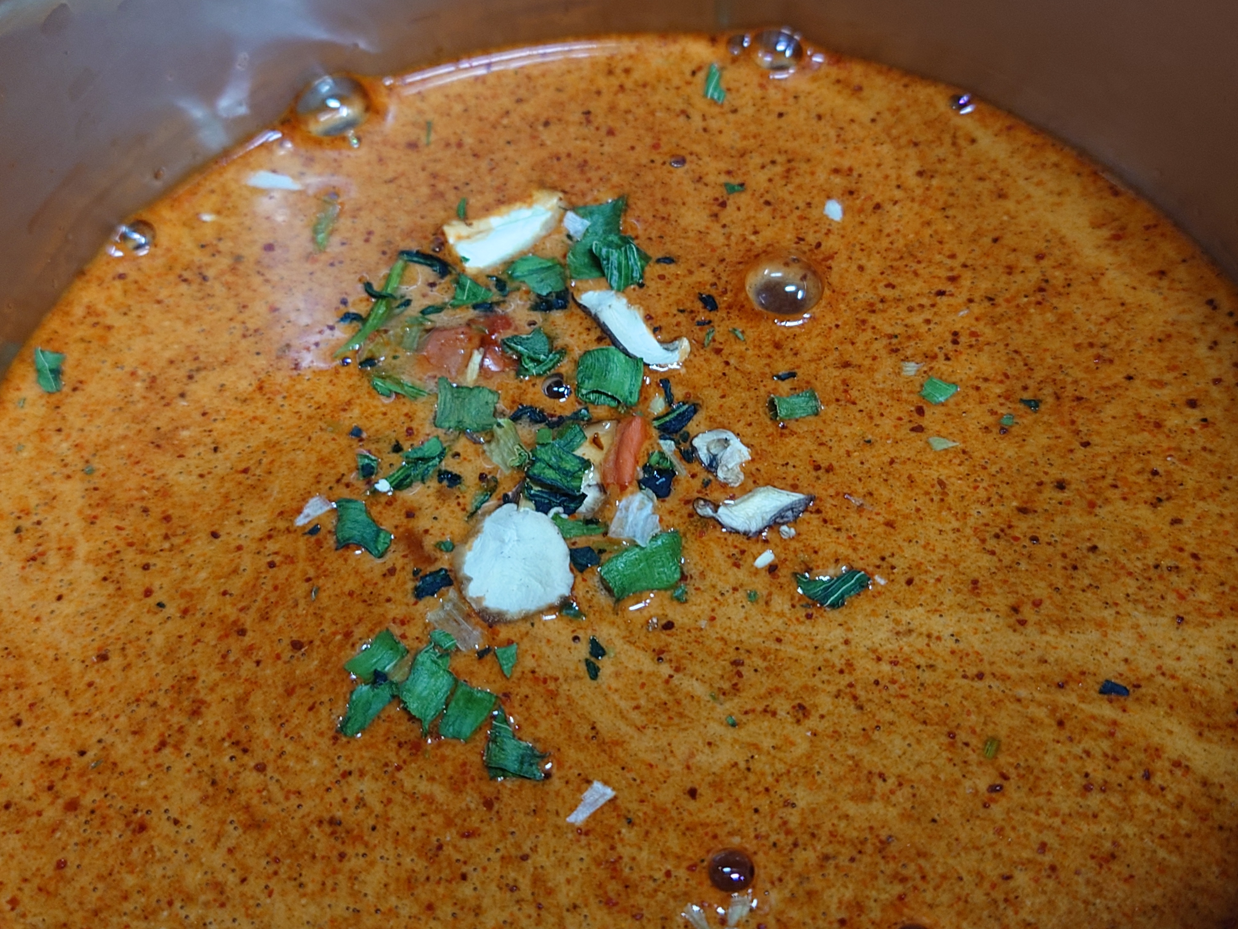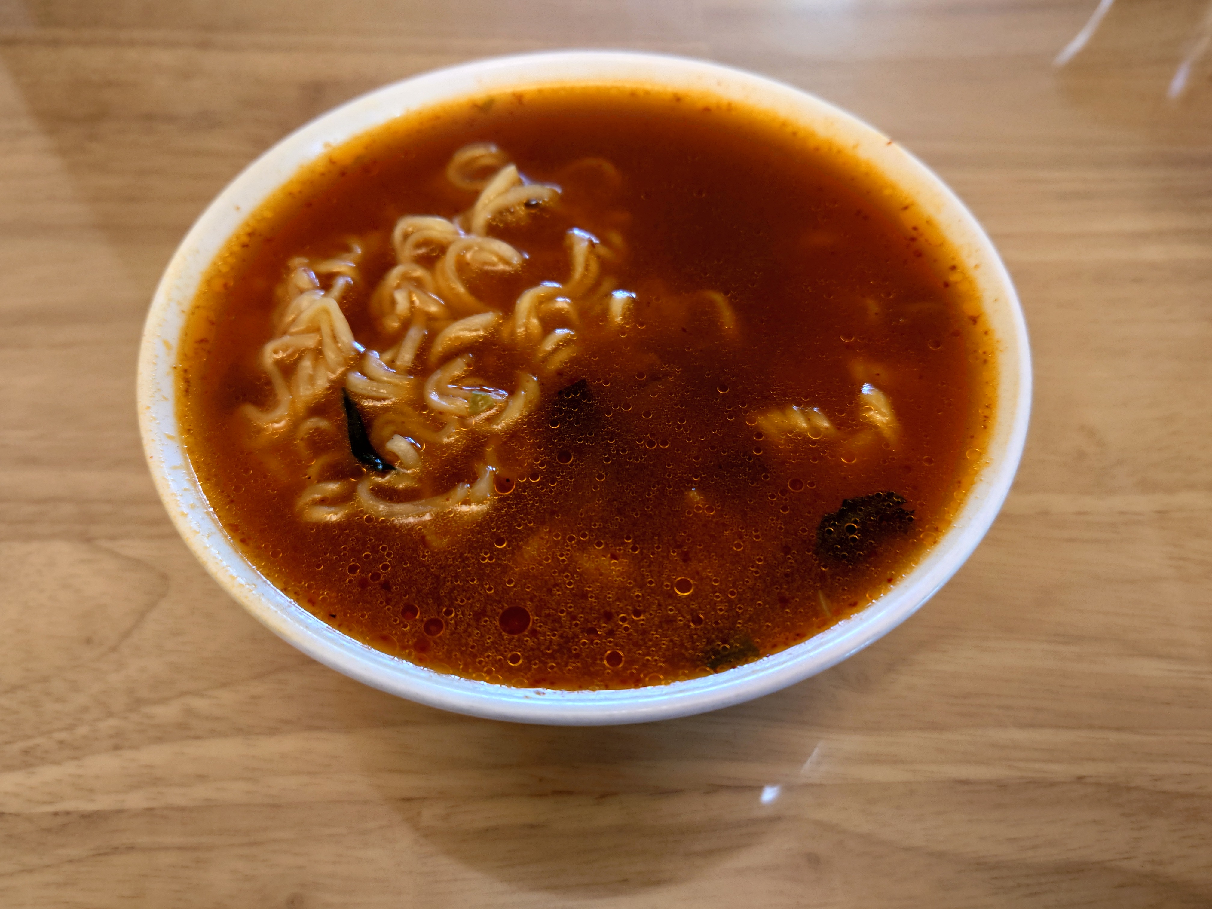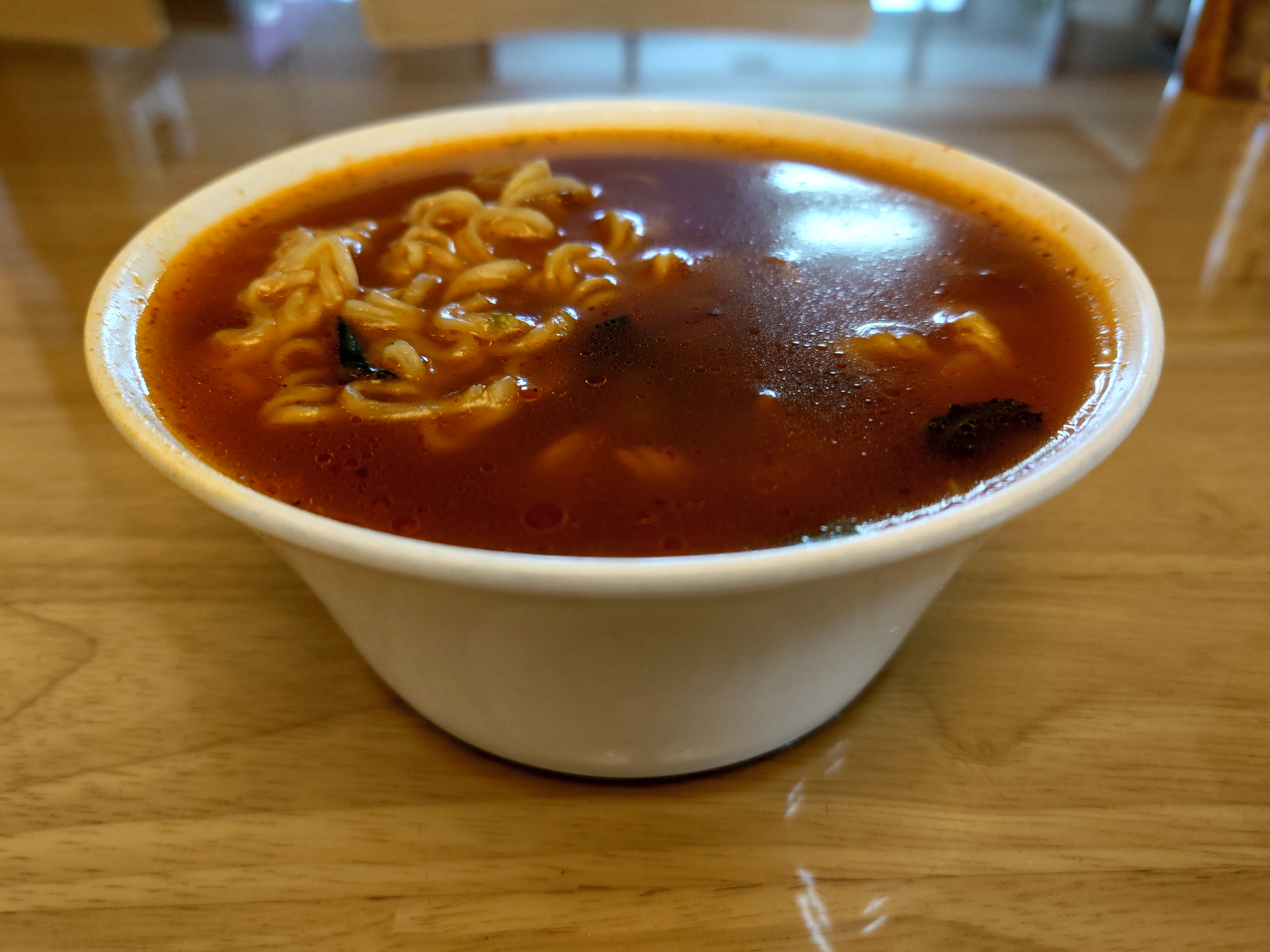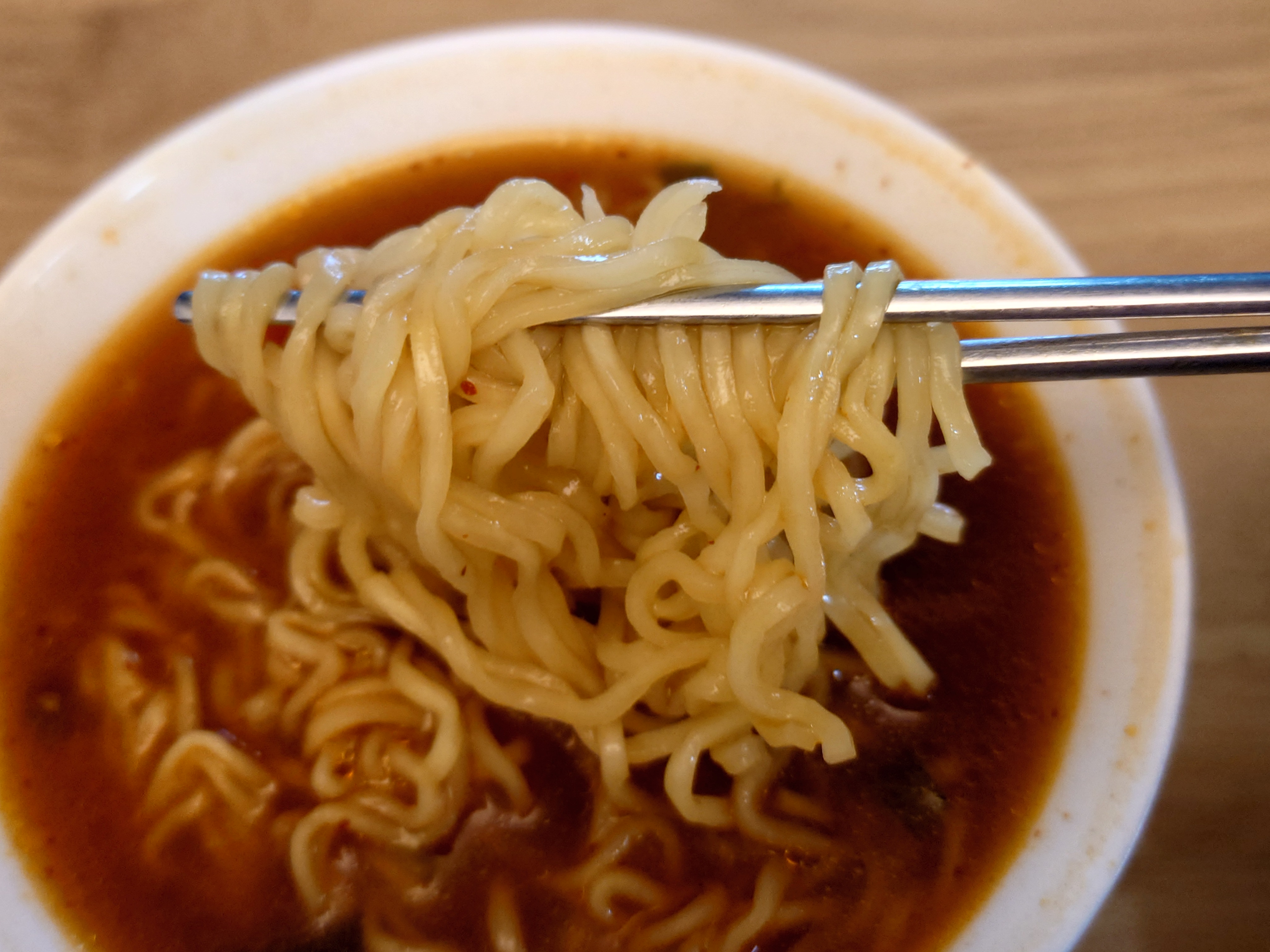 얼큰한 국물에 라면을 튀긴 팜유가 가미되어 맛있는, 한국의 매운 라면에는 역시 건면이 어울리지 않는다. 문자 그대로 물과 기름과 같은 사이랄까? 야채 조미유를 별첨한 것은 그 부분을 커버하기 위해서로 보이나 역시 한계가 있어서, 국물에 어느정도 감칠맛을 내 주지만 면을 먹을 때는 깔끔함(=밍밍함) 이 느껴지고 만다.