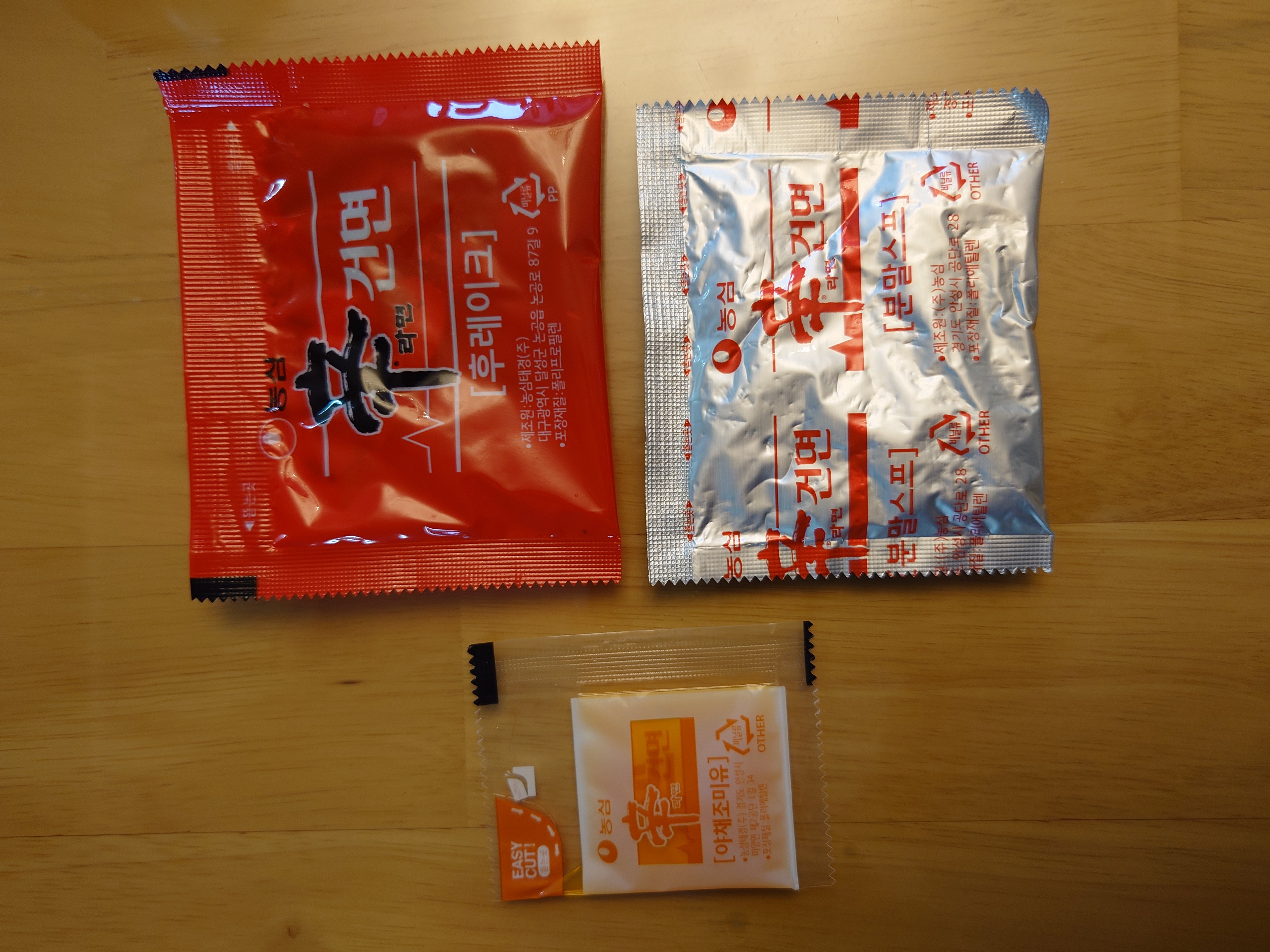 3종의 스프. 신라면에 야채 조미유? 대략 어떤 의도인지 짐작이 된다.