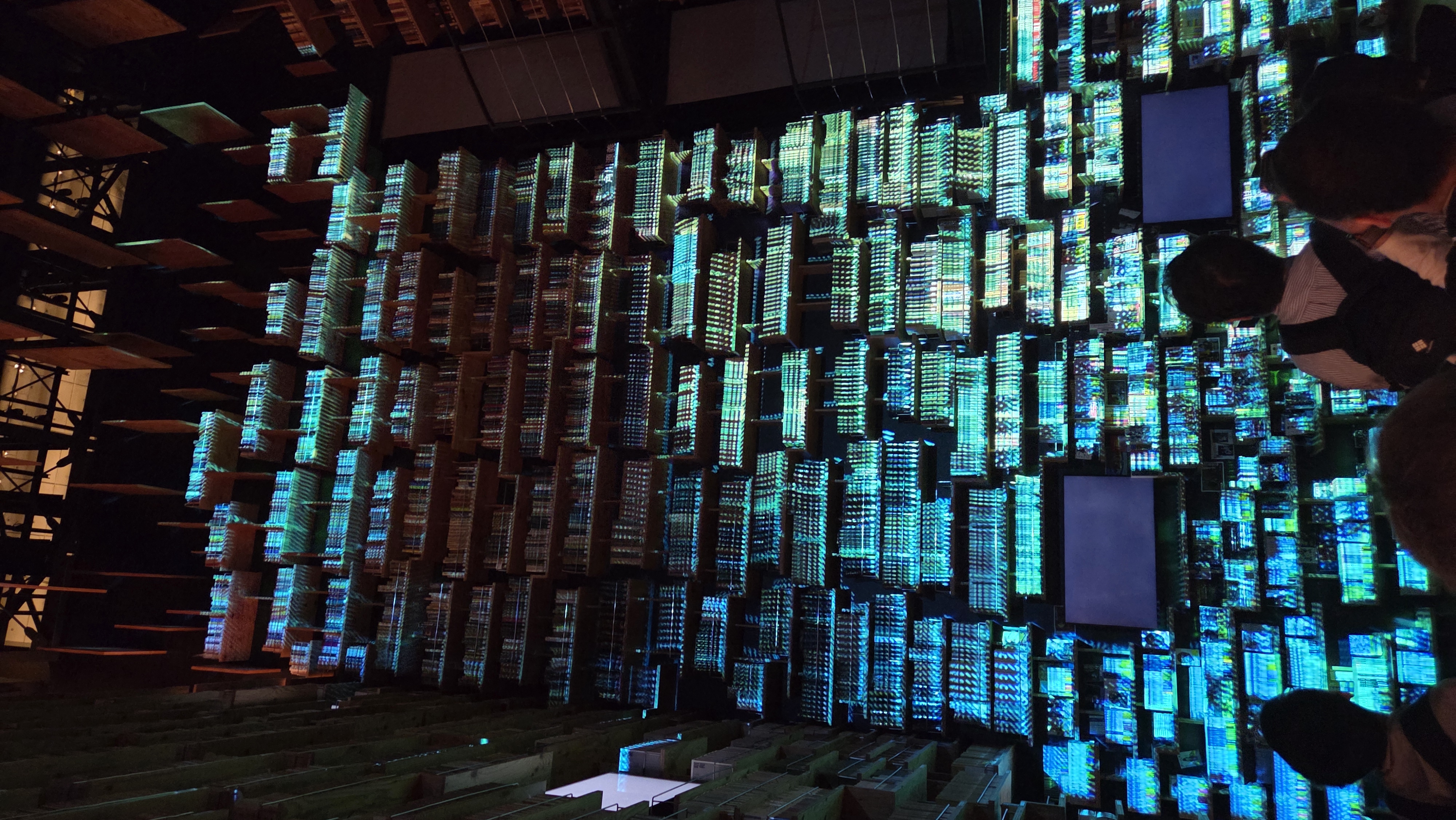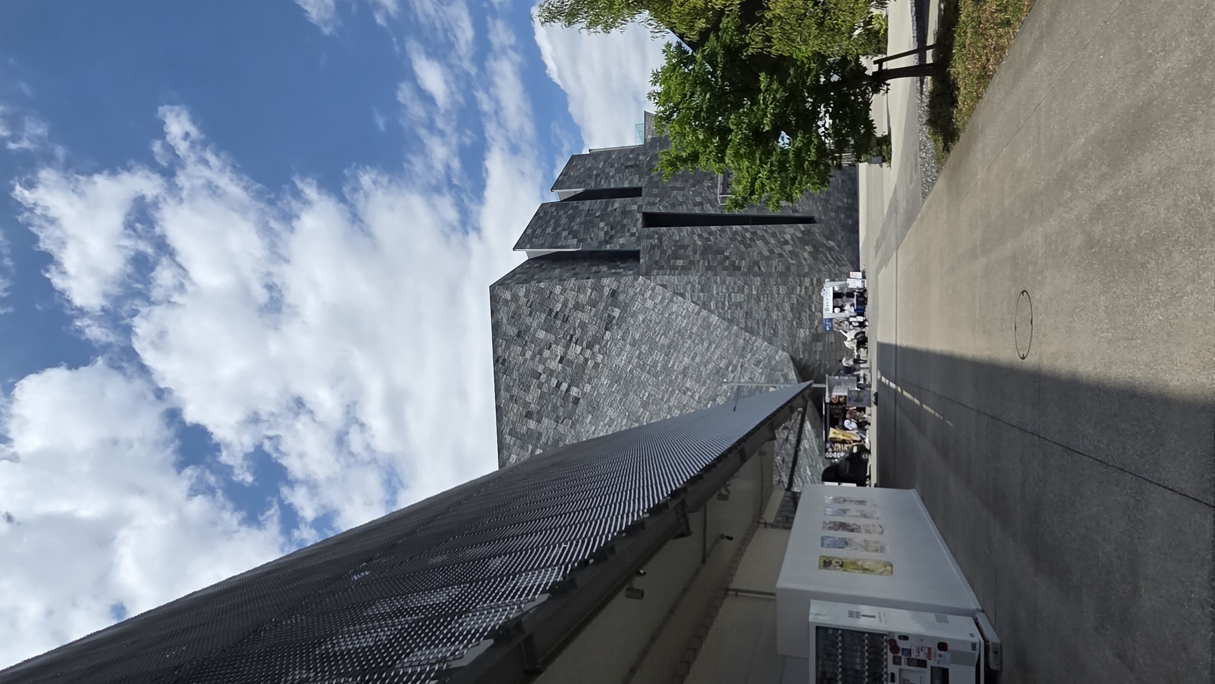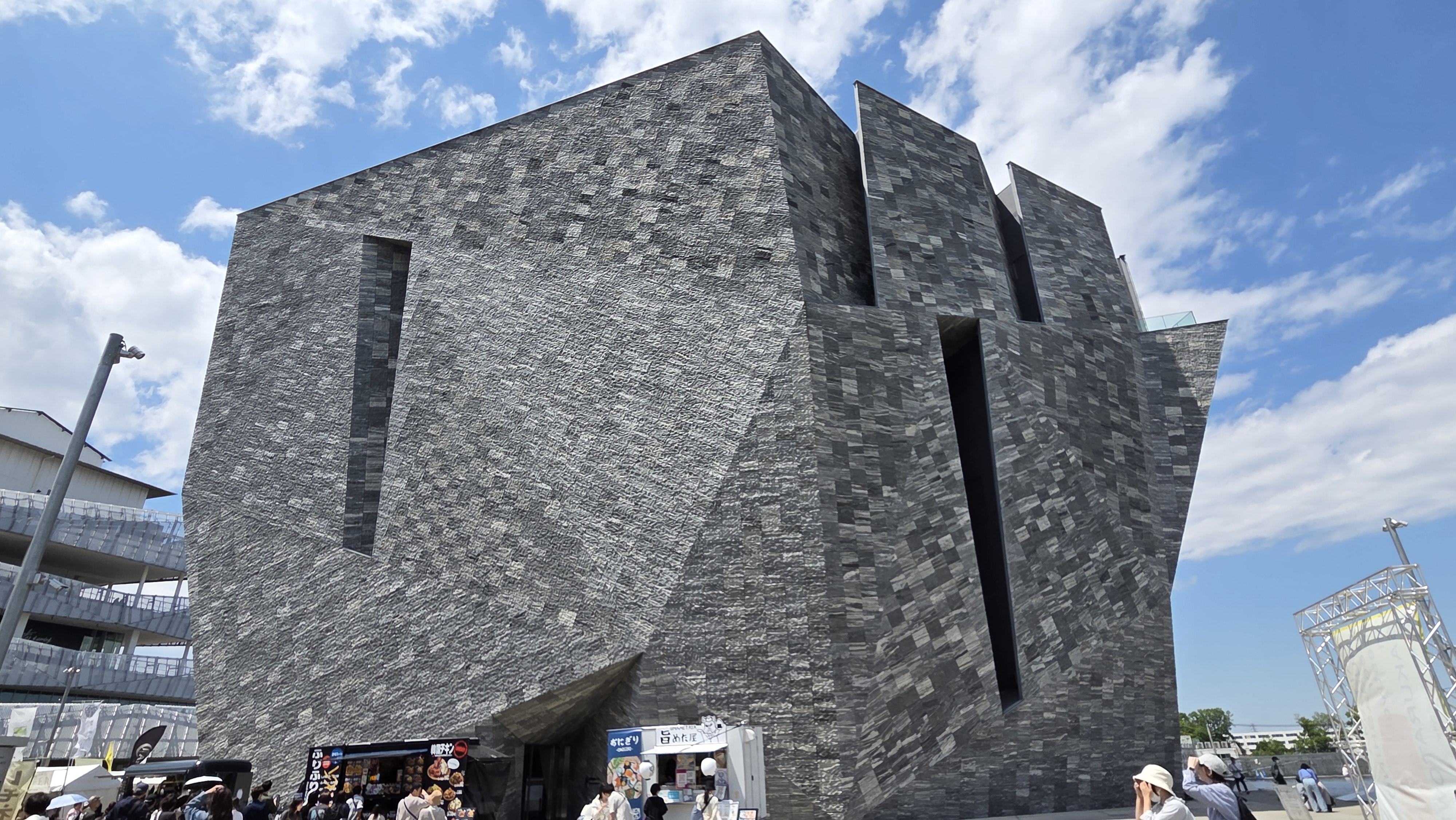 가까이에서 보니 더 웅장한 건물. 감수를 맡은 건축가 쿠마 켄고(隈研吾)에 의하면, '땅 속 깊은 곳에 있는 지층에서 고대의 화산 적층물이 지표면으로 솟아나오는 이미지를 건축화했다.' 고 한다. 하늘에서 떨어진 것이 아니라 땅에서 솟아오른 것이었다. 아무튼 SF영화의 첫 장면에 나와도 어색하지 않을 만큼 그 웅장함은 확실하다.