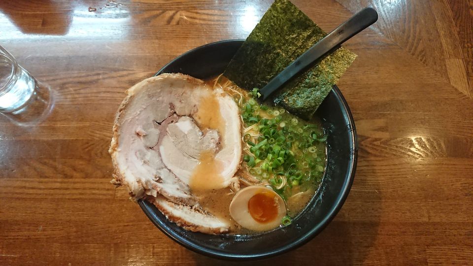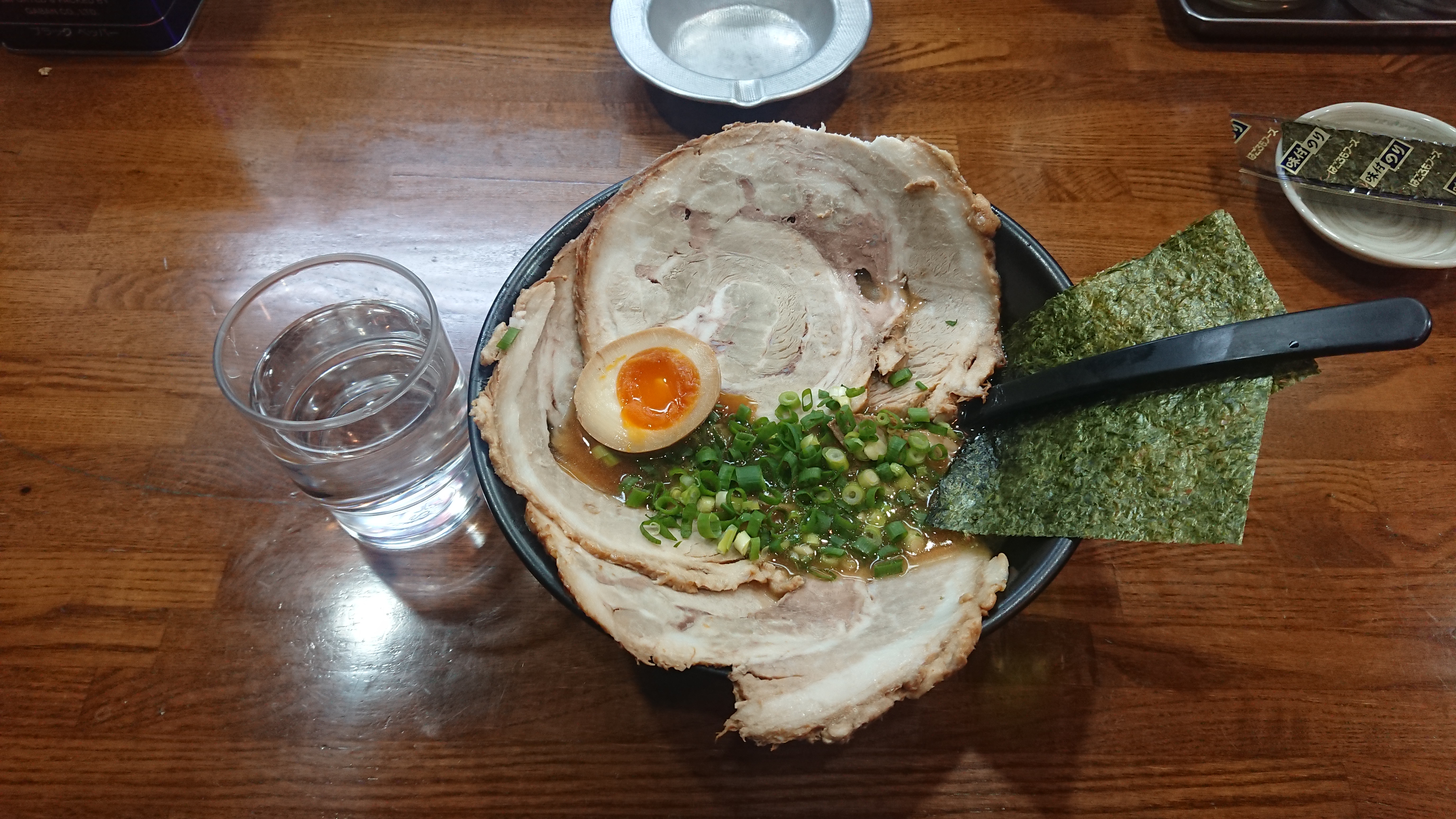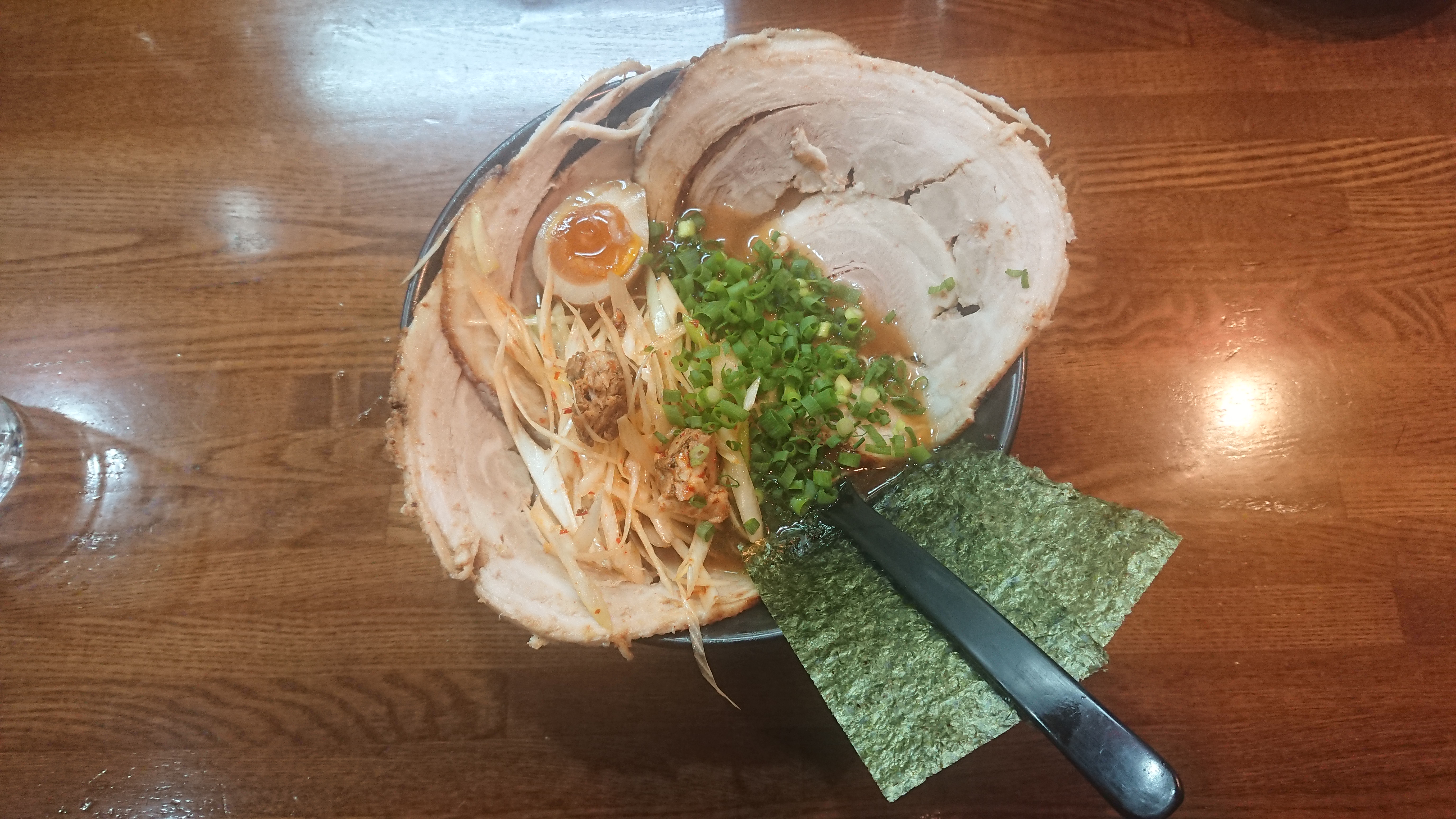 받아들자마자 싸다구라도 날릴 수 있을 듯한 거대한 챠슈가 한 장 올라가 있고, 반숙 맛계란도 올라가 있다.