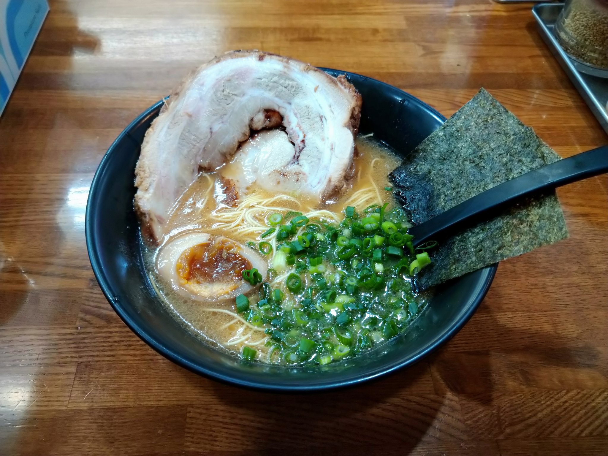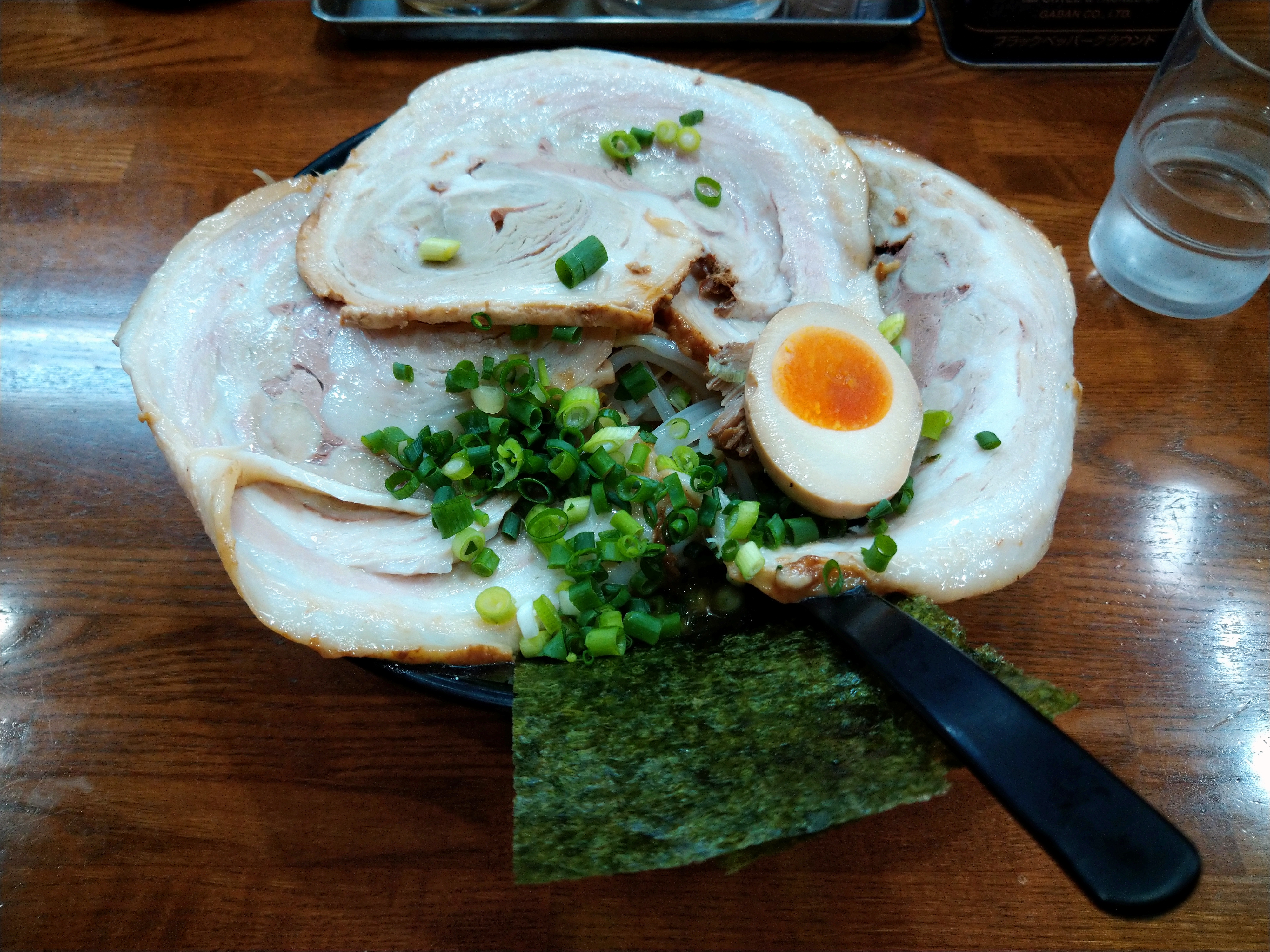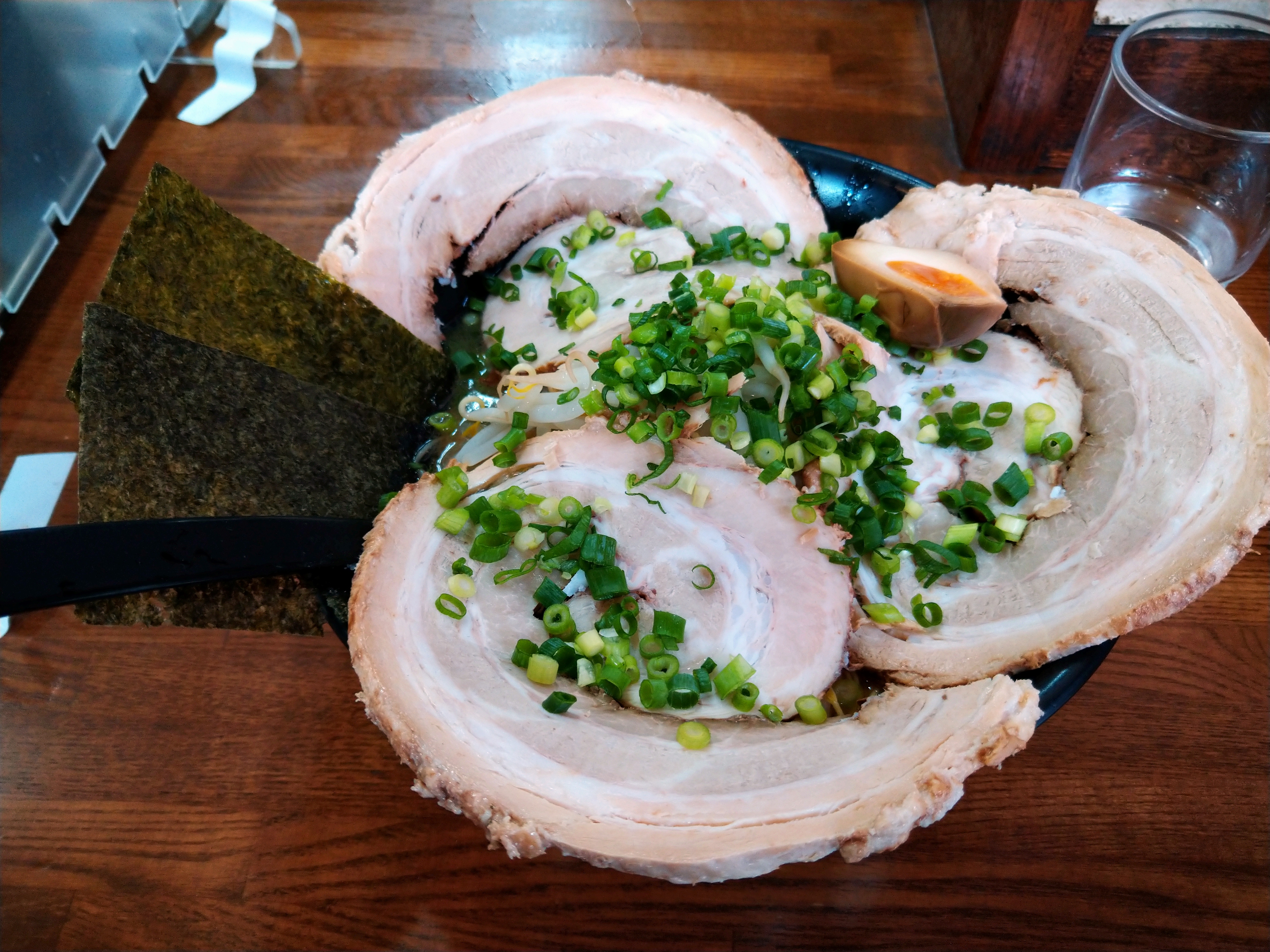 받아들자마자 싸다구라도 날릴 수 있을 듯한 거대한 챠슈가 한 장 올라가 있고, 반숙 맛계란도 올라가 있다.