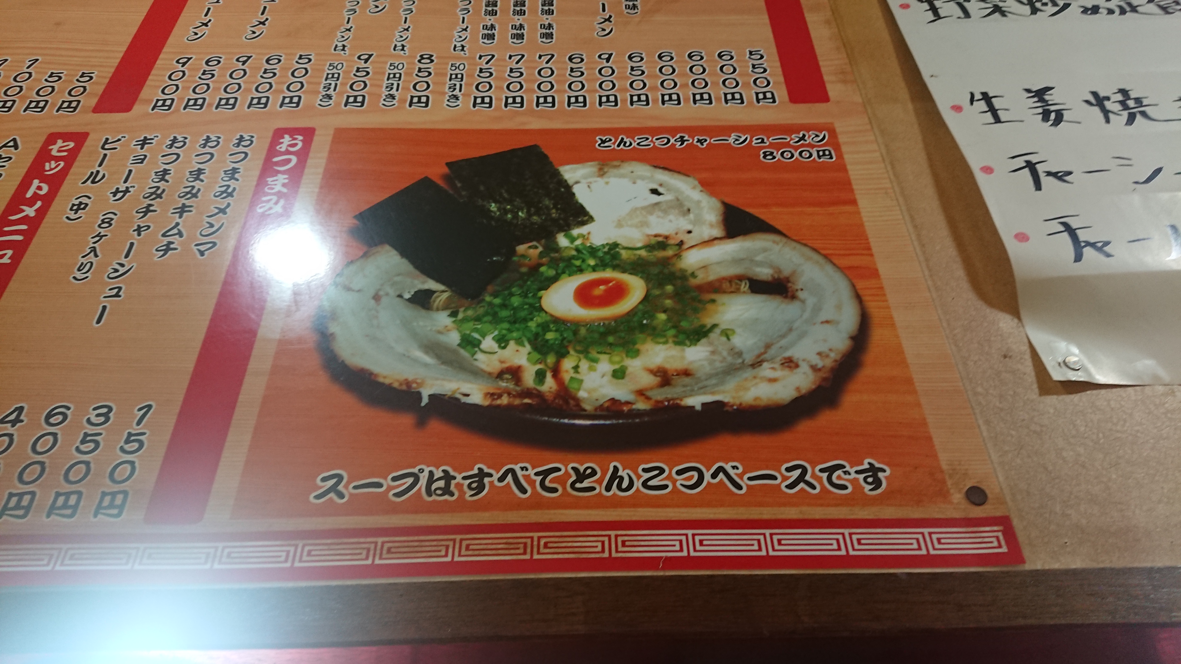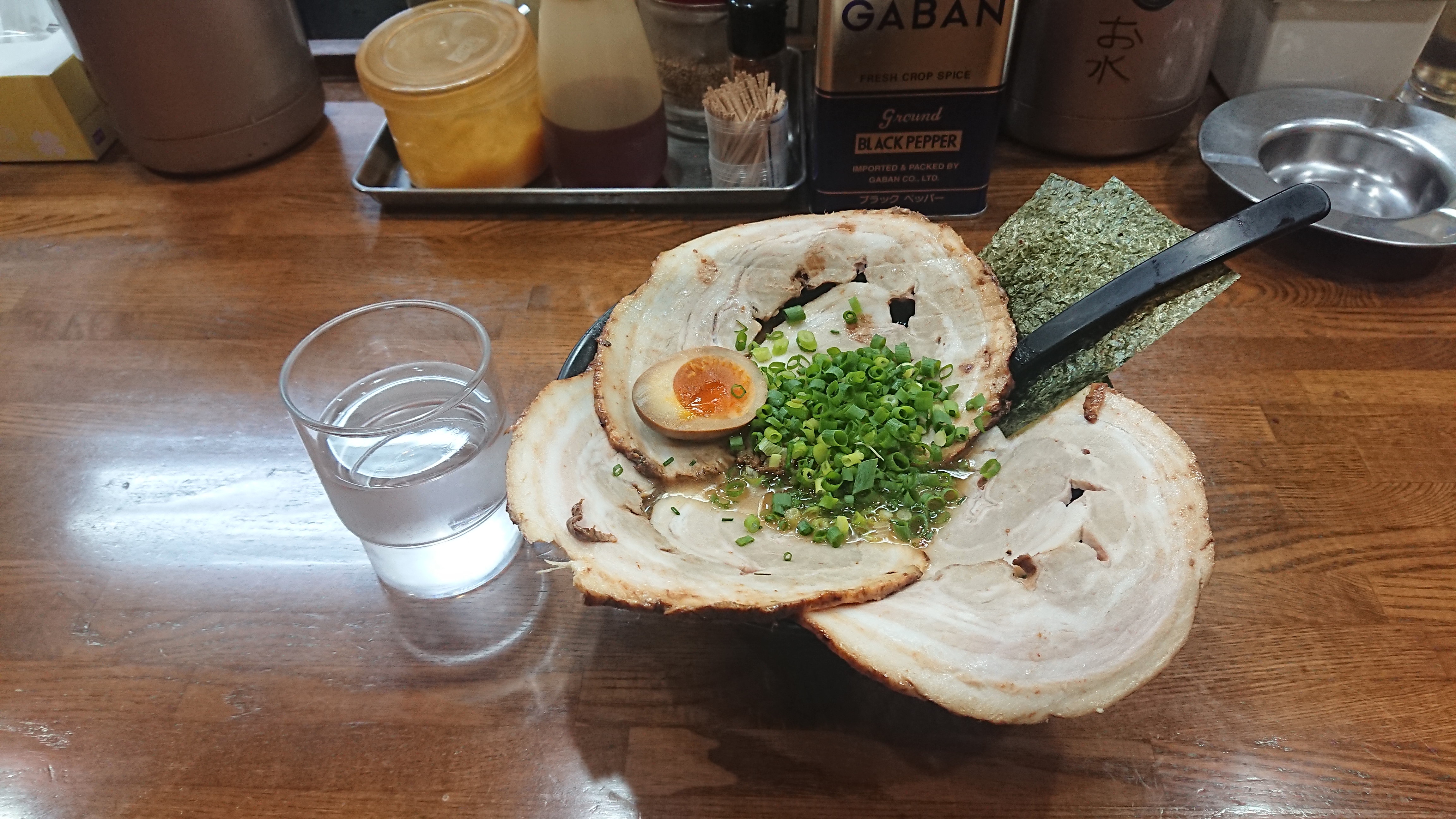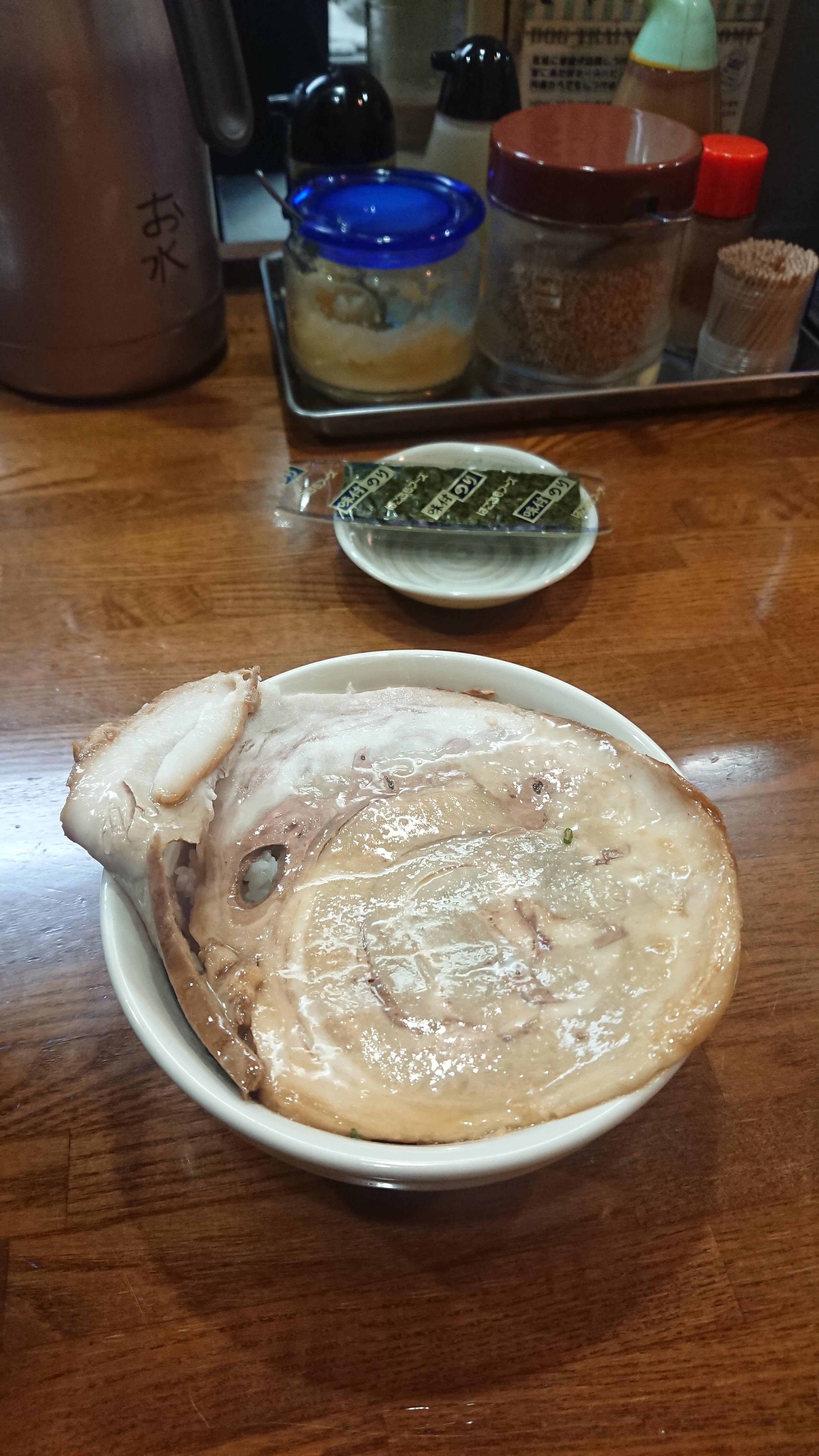 거대한 챠슈 3개를 그냥 국물과 먹으면 짜면서 느끼하기 때문에, 그 경우에는 공기밥(100엔)을 하나 시킨다.