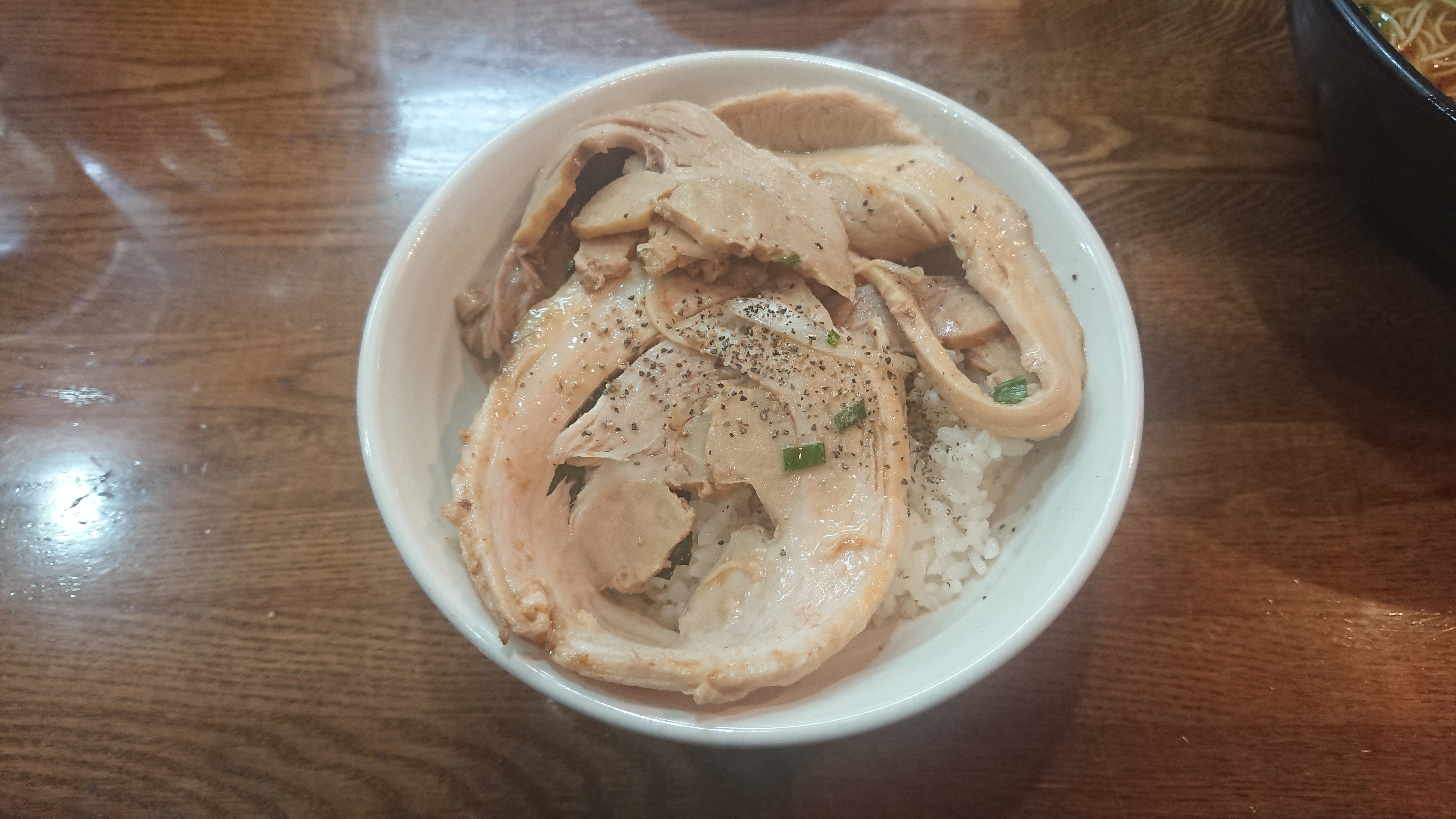 밥 위에 챠슈 2장을 얹고 후추를 살짝 뿌려주면 그냥 챠슈동. 가게에서 직접 구워 만들어주는 챠슈동도 별미이지만, 이렇게 라멘 국물을 끼얹어 먹는 것이 좋다.