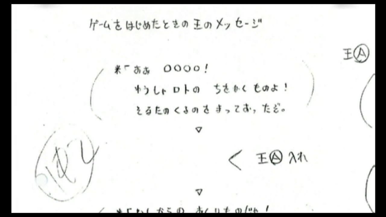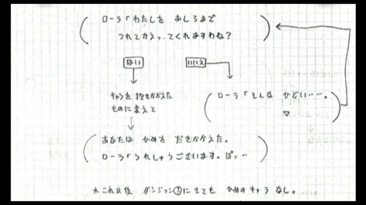 시나리오와 대사 선택 시스템도 볼 수 있다. 캐릭터의 이름을 입력해서 출력해주는 시스템도 이미 준비되어 있고, 단순하지만, 대사 선택 분기도 이미 만들어져 있다. 이 선택지에서는 전무후무한 '공주님 안아들고 귀환' 이벤트가 발생한다. 대사와 시스템 기획이 함께 들어있는 것은, 이미 포토피아 연속살인사건과 같은 어드벤처를 만들어 온 호리이 유우지이기에 가능했을 듯.