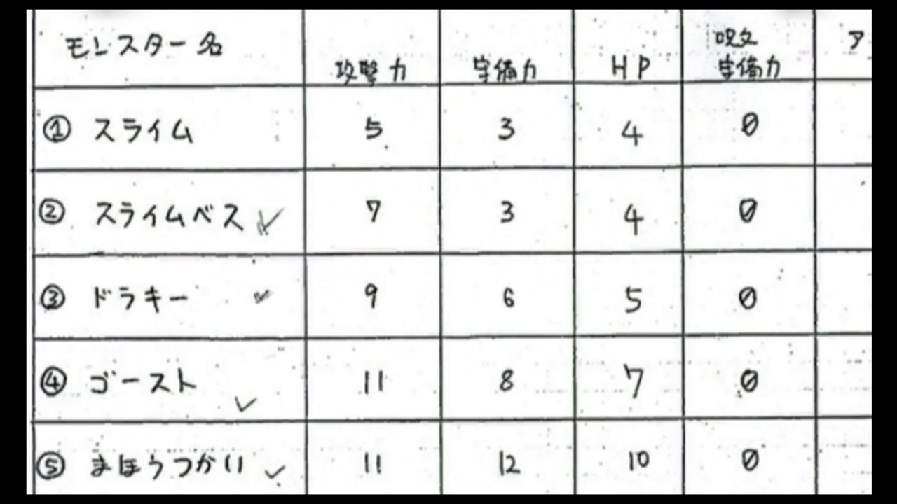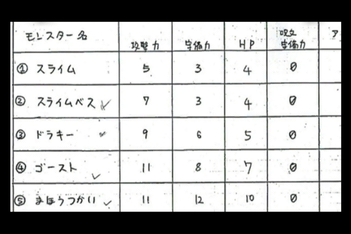 몬스터의 능력치 테이블도 수록하고 있다. 드래곤 퀘스트를 처음 플레이해 보면 파이널 판타지와 달리 초반에 높은 빈도로 사망하곤 한다. 도라키를 귀엽다고 얕보다가 죽고, 슬라임 베스에게 멋모르고 덤비다가 죽고, 체력 약간 남긴 채 돌아오다가 슬라임을 만나서 죽고... 하지만 레벨을 1만 올리면 아주 수월하게 이길 수 있게 된다. 시간을 들여 강해지기는 RPG의 근본이지만, 직접 플레이해 보면 이 밸런스가 매우 절묘함을 느낄 수 있다.