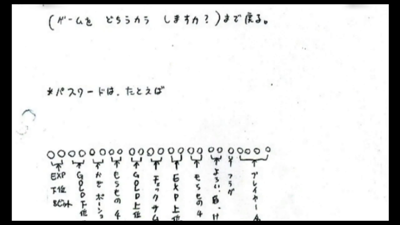 부활의 주문 패스워드 입력 시스템. 당시 패미컴 팩에는 세이브를 하기 위한 메모리는 커녕, 데이터를 보관할 배터리조차 넣을 예산이 부족했기 때문에 패스워드를 입력해서 데이터를 복원하는 시스템을 준비했었다. 히라가나 2글자마다 각각의 진행 정보를 저장해두고 있었다. 이런 시스템을 게임 디자이너가 미리 고안하고 있는 것도 이미 기계어 프로그래밍에 능숙했던 호리이 유우지였기에 가능했을 듯.