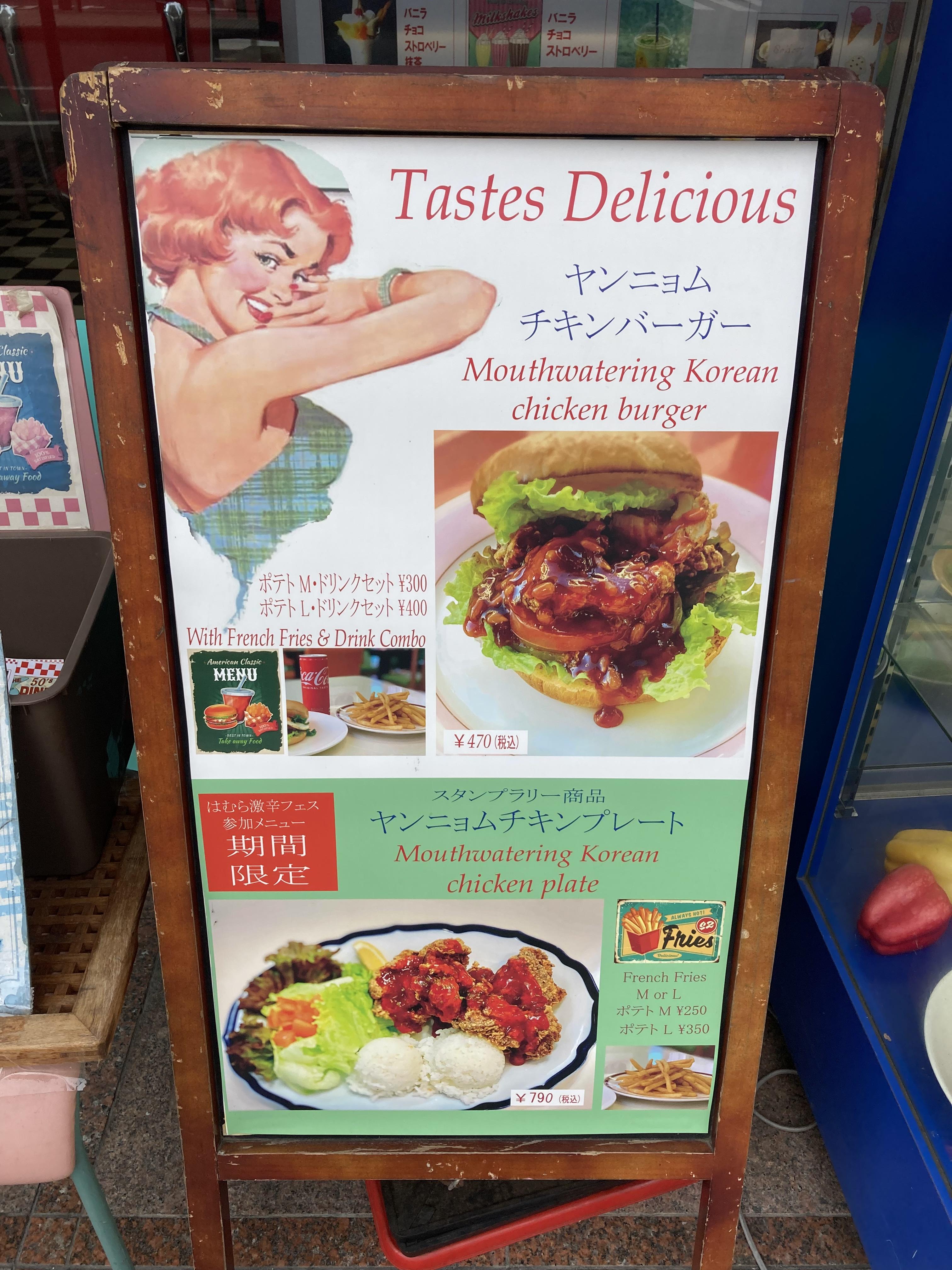 기간한정 메뉴 양념치킨 버거와 양념치킨 플레이트. 일본에서 한국음식이 정말 인기가 많아서, 얌뇸치킨 이라고 30대 이하는 다 알아듣고 치즈 닭갈비는 학교 급식에도 나와서 모르는 사람이 거의 없을 정도.