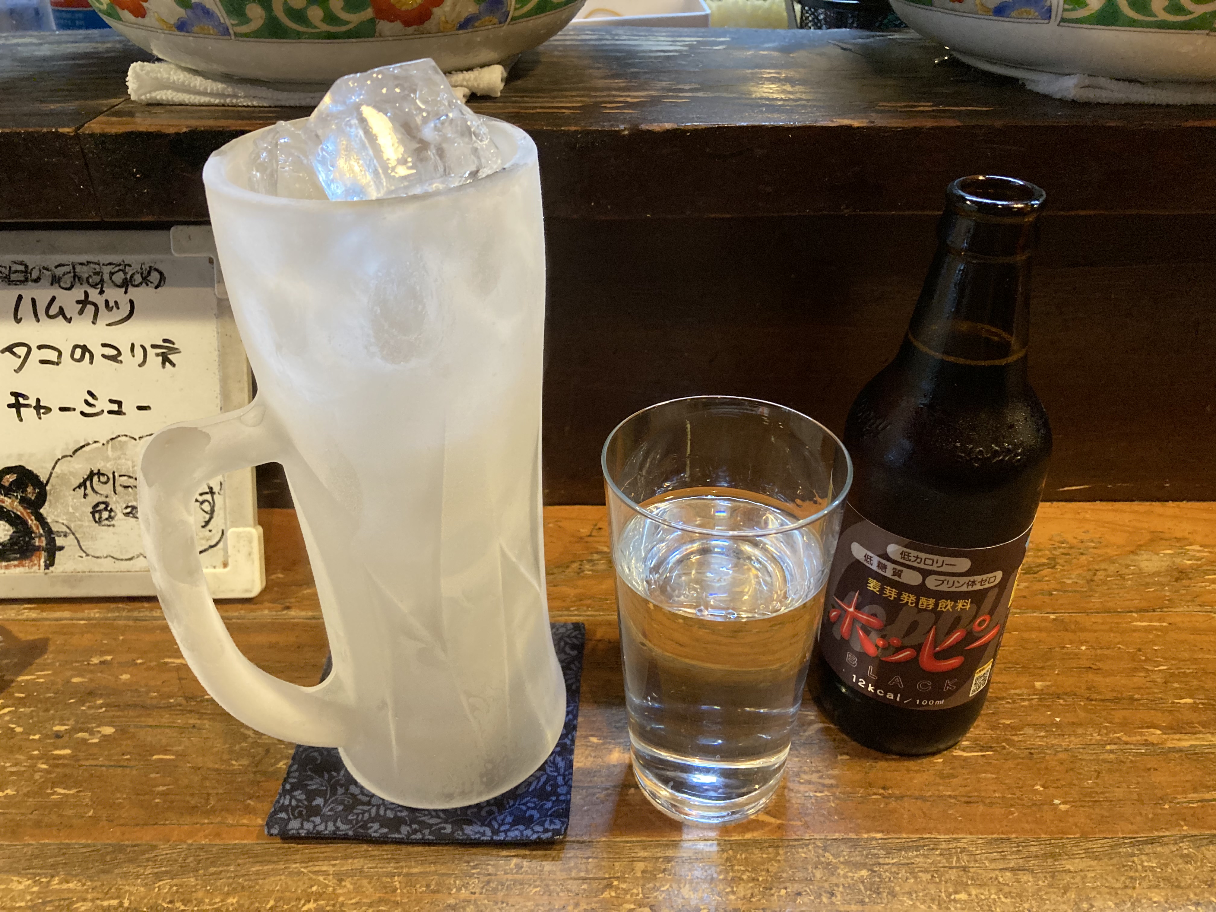 언제나처럼 먼저 홉삐 쿠로(ホッピー黒) 세트를 시켰다. 홉삐는 맥주맛이 나는 무알콜 음료로, 맥주가 귀하던 시절 맥주맛을 내기 위해 만들어졌다고 한다. 지금은 소주에 타서 마시는 맥주맛 토닉워터 비슷하게 되어 있어서 이자카야 세 곳중 한 곳 정도 비율로 홉삐를 판다. (관서 지역에는 없다고!)