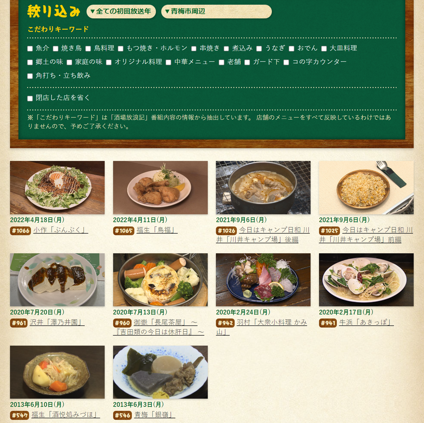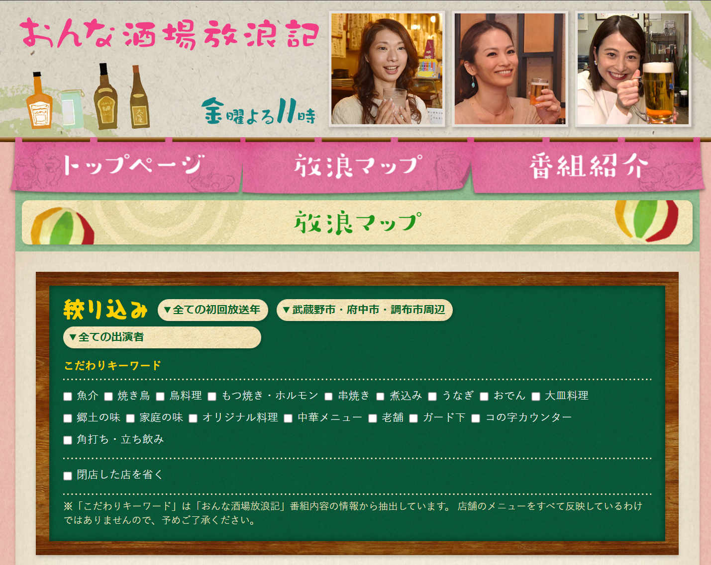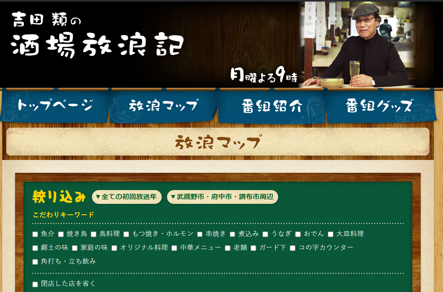 워낙 역사가 긴 만큼 프로그램 홈페이지에서 그동안 방송한 가게를 지역별, 장르별로 필터해서 찾아볼 수 있는 방랑 맵을 제공하고 있다. 이 방랑맵만 찾아다녀도 도쿄의 숨은 맛집은 다 찾아볼 수 있고, 특집으로 지방의 이자카야도 소개한다.
