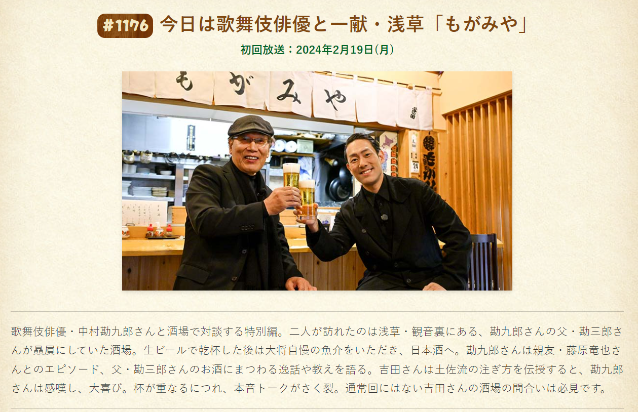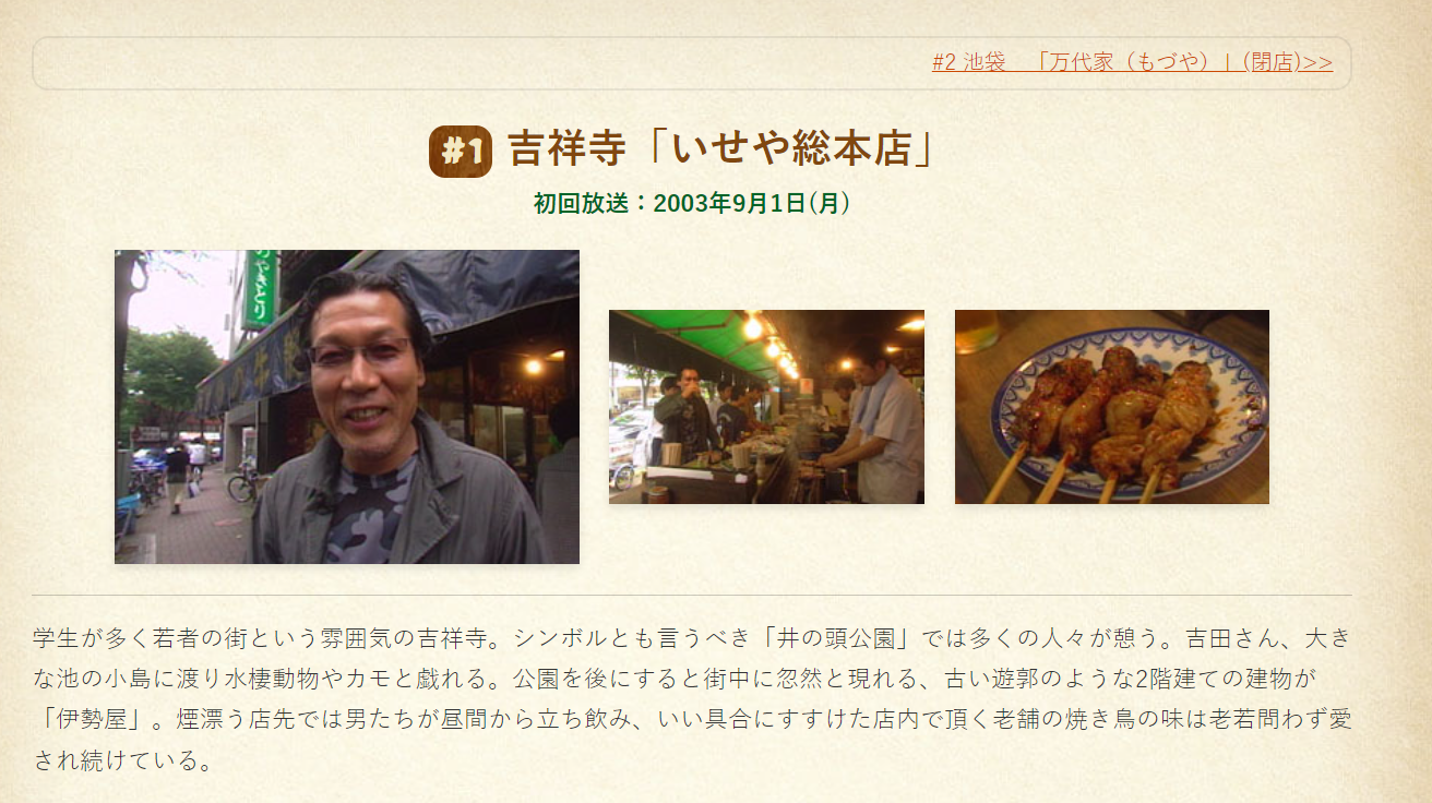 먼저 이자카야 방랑기(酒場放浪記)에 대해 간단히 소개하면, TBS계열에서 20년 째 장수하고 있는 이자카야 프로그램이다. 내용은 아주 심플해서, 시인이자 방랑객 요시다 루이(吉田類)가 도쿄의 한 역을 방문해서 낮에는 조용하게 동네를 산책하고 신기한 가게 저녁이 되면 목적지인 이자카야에 가서 마시는 것. 가게를 나와서 가게 이름으로 시를 하나 짓고 '그럼 저는 한잔 더 하겠습니다~' 하며 끝.