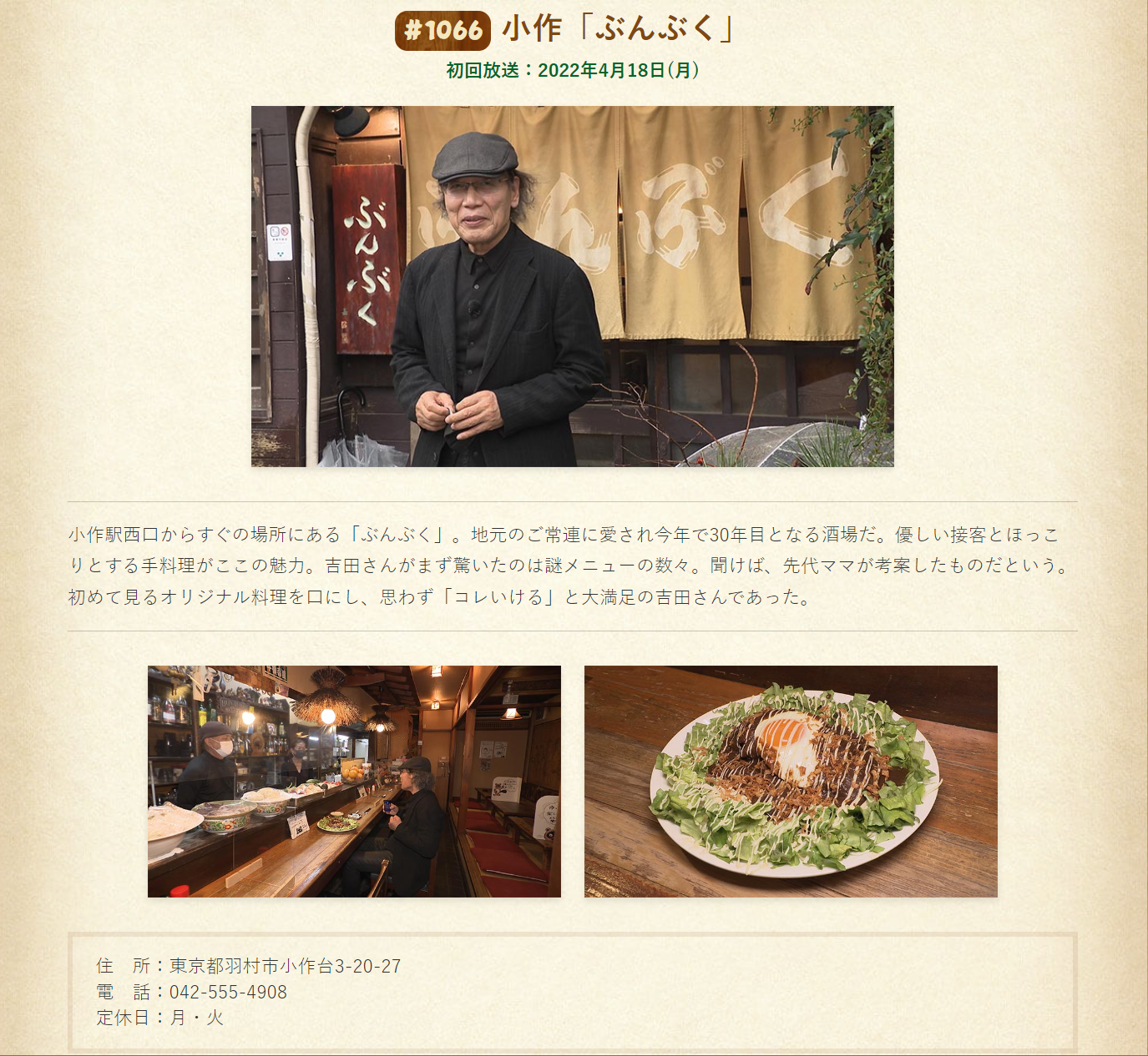 하무라 시로 필터하니 마침 내가 가봤던 오자쿠(小作)가 첫번째로 뜨길래 바로 픽했다. 가게 이름도 너무 귀여운 분부쿠. 방송을 보기 시작하기 불과 두어달 전에 방송했다니 크으으... 탄식을 뒤로하고