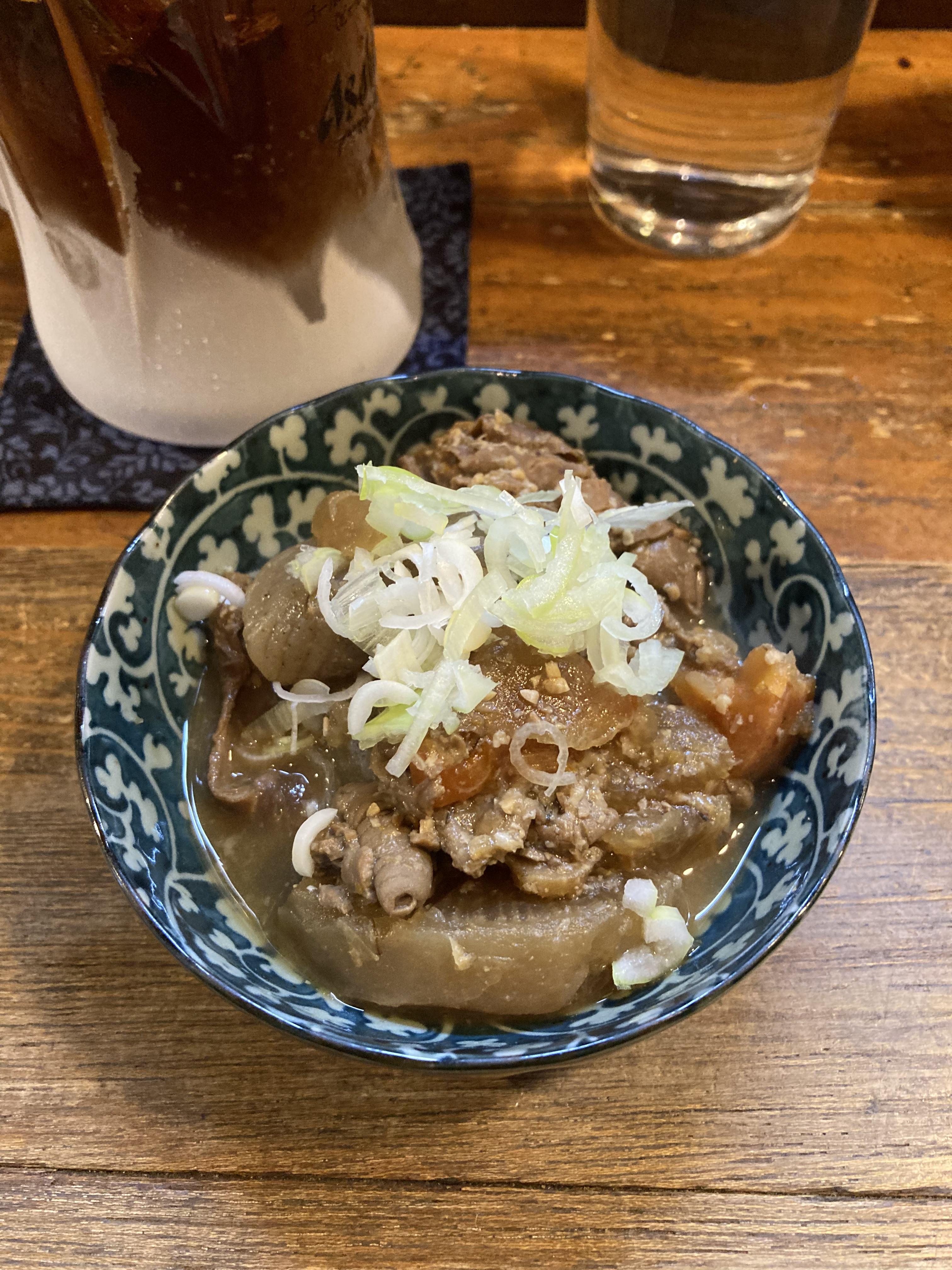 먼저 모츠니코미(もつ煮込み)를 주문. 돼지곱창을 된육수에 푹 익힌 요리로, 함께 푹 삶아진 무와 당근도 단맛을 더해준다. 많은 이자카야에 있지만 손이 많이 가기 때문에 제대로 해서 내는 집은 적고, 이 요리를 간판으로 하는 이자카야도 있을 정도로 평범하면서 깊이있는 요리.