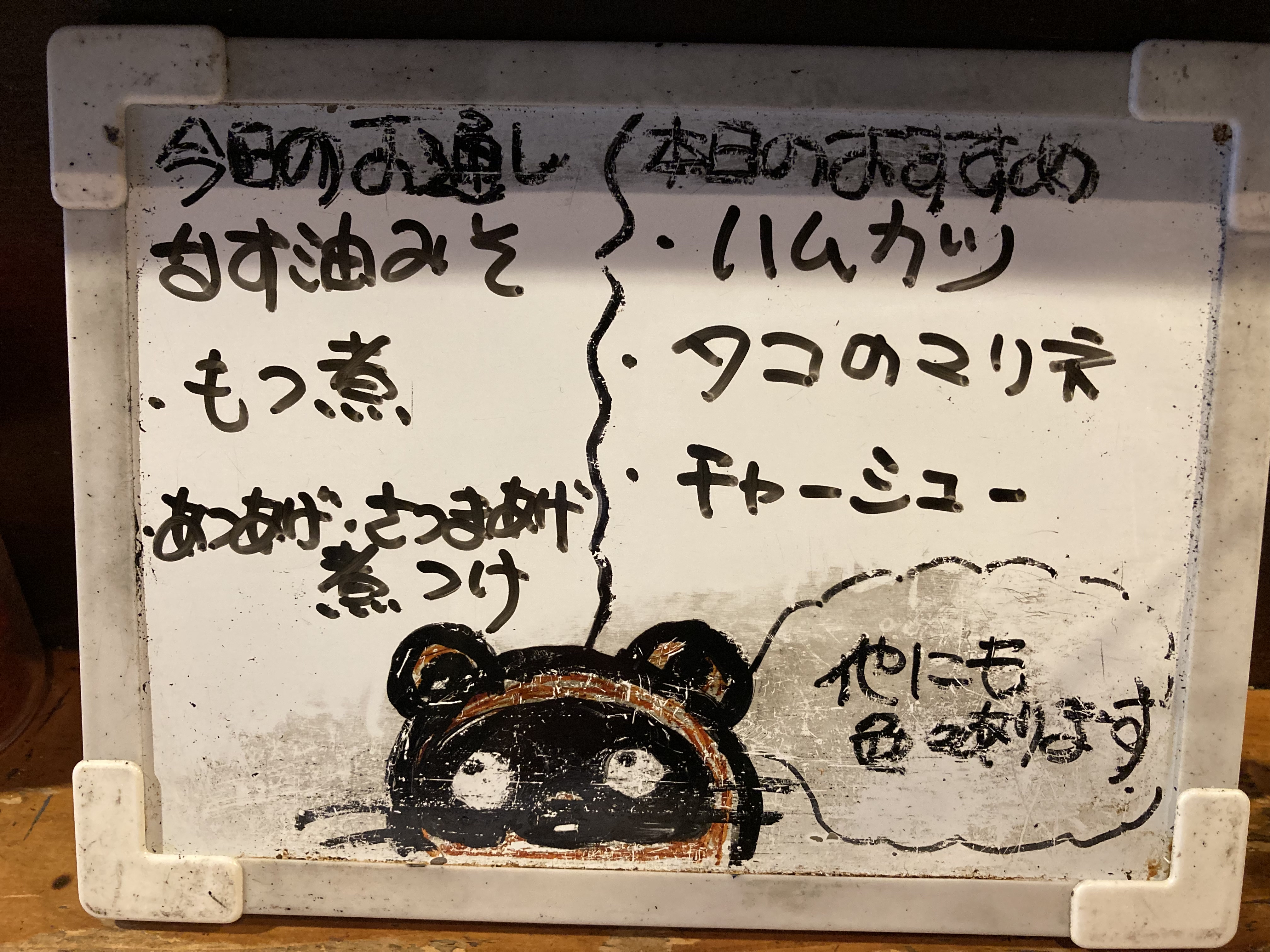 가게에 전시된 요시다 루이씨가 그려진 병을 보고 물어보다가, 통성명을 하다보니 이자카야 방랑기를 따라나섰다고 이야기하게 되었다. 점장님이 '방송 보고 온 거구먼?' 이라고 털털 웃으시지만 못 봐서 억울한 것은 덤. 이야기를 들어보니 이자카야 방랑기는 디렉터와 스탭이 일단 탐색전으로 가게에 들른 다음에 여기다 싶으면 촬영 제의를 한다고 한다. 분부쿠에 교섭이 온 그 날은 오자쿠의 여러 곳을 다녔지만 마땅한 곳이 없어서 발을 동동 구르다가 마지막으로 찾은 가게였다고.