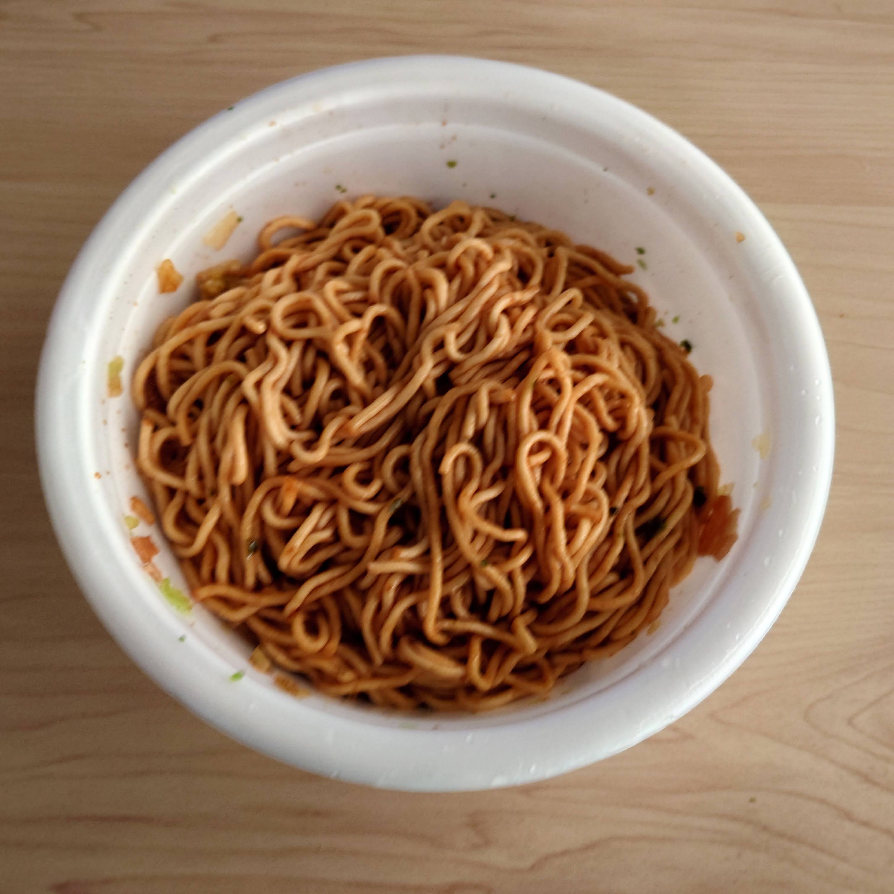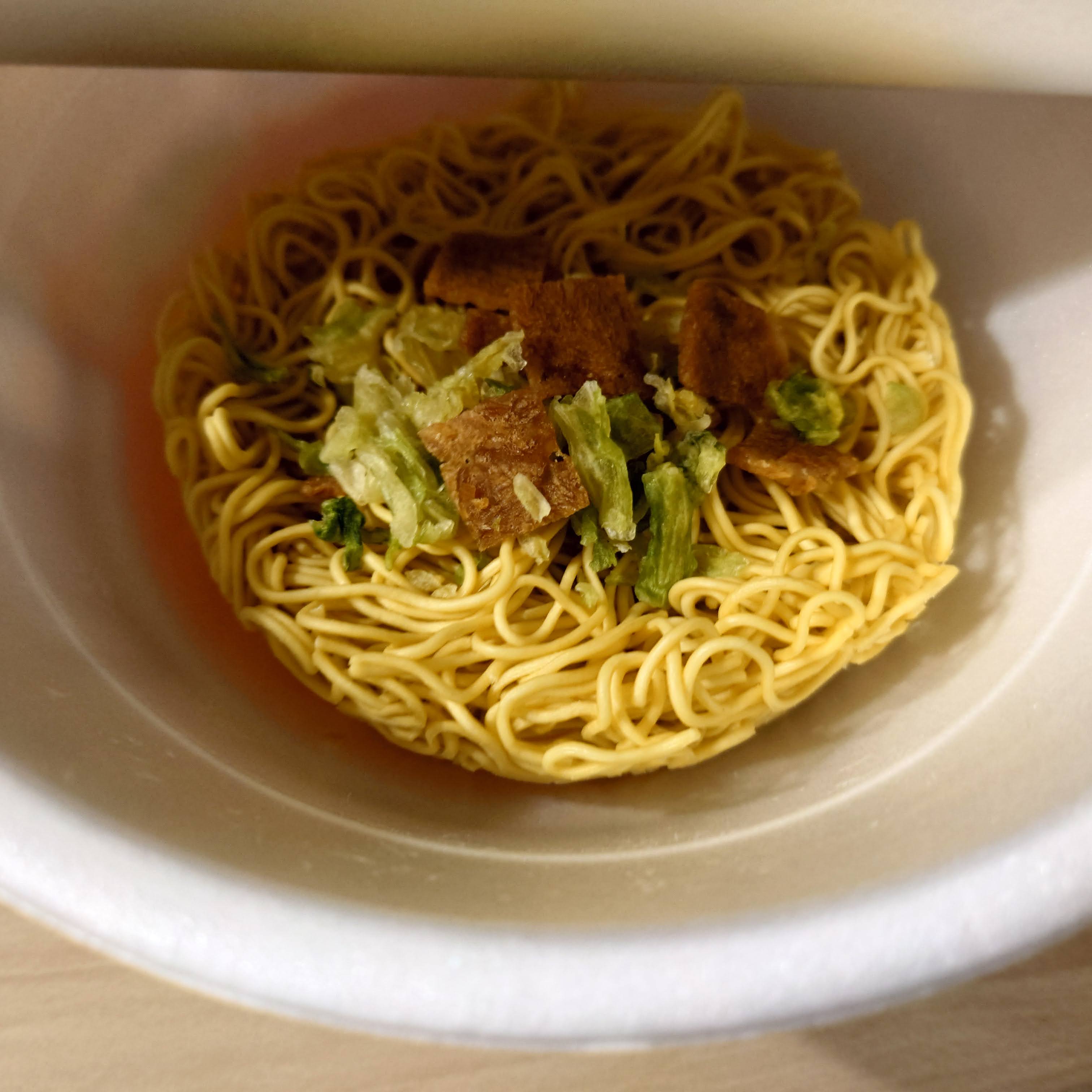 면에 건더기 스프만 올린 모습. 이 시리즈도 튀기지 않은 건면이었다. 면 장인 시리즈를 만든 닛신이기에 기대해 볼 만 하지만 야키소바로서는 좀 가늘어서 괜찮을까.. 하는 생각이 들었고, 건더기스프를 포함한 볼륨감도 상당히 부족해 보였다.