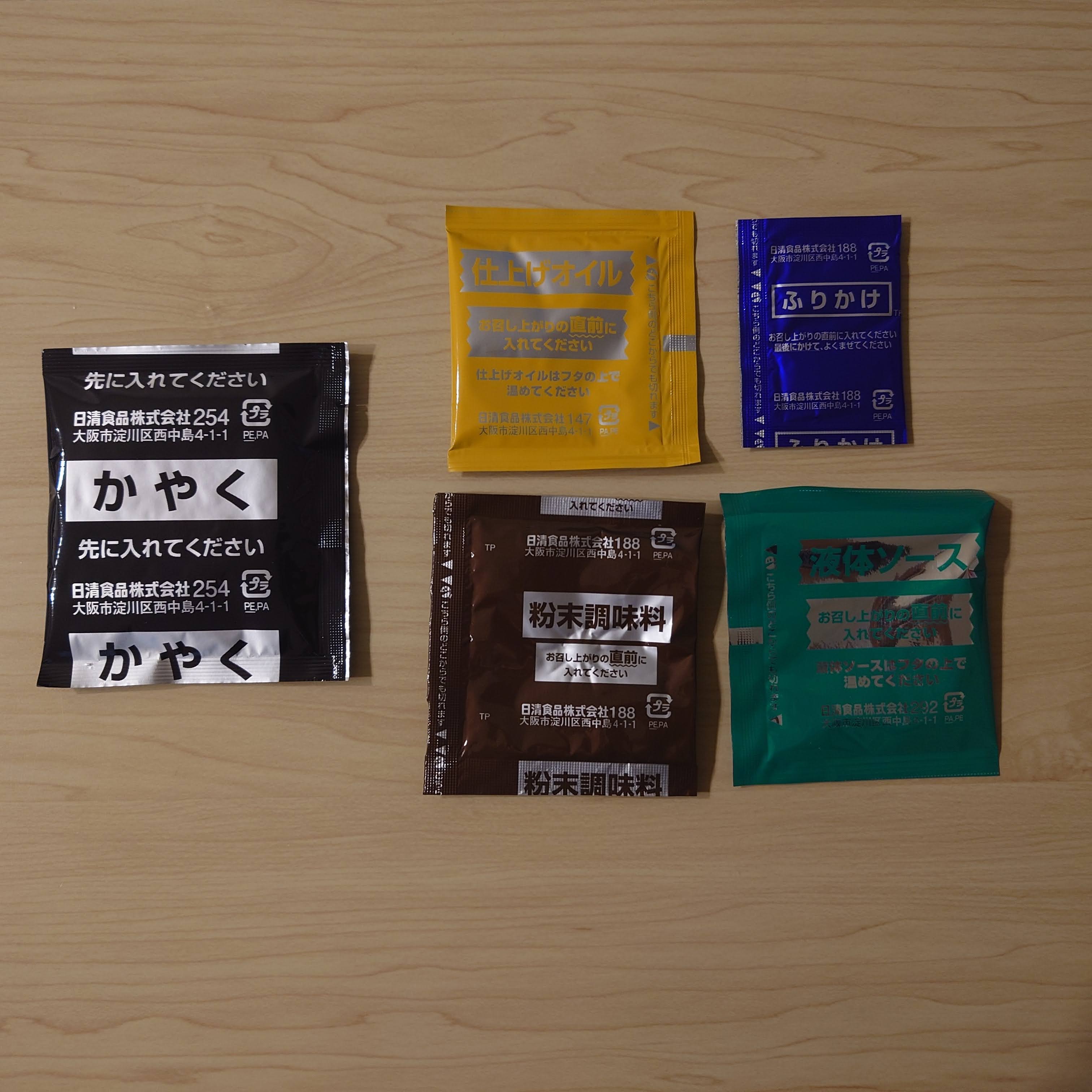 스프가 5개나 들어있다! 조미김이나 챠슈 등의 특수재료가 있는 컵라면인 경우에 3~4개 들어있는 경우가 있는데, 역시 완전메시 시리즈. 이건 뭐부터 넣어야 할 지 모르겠다.