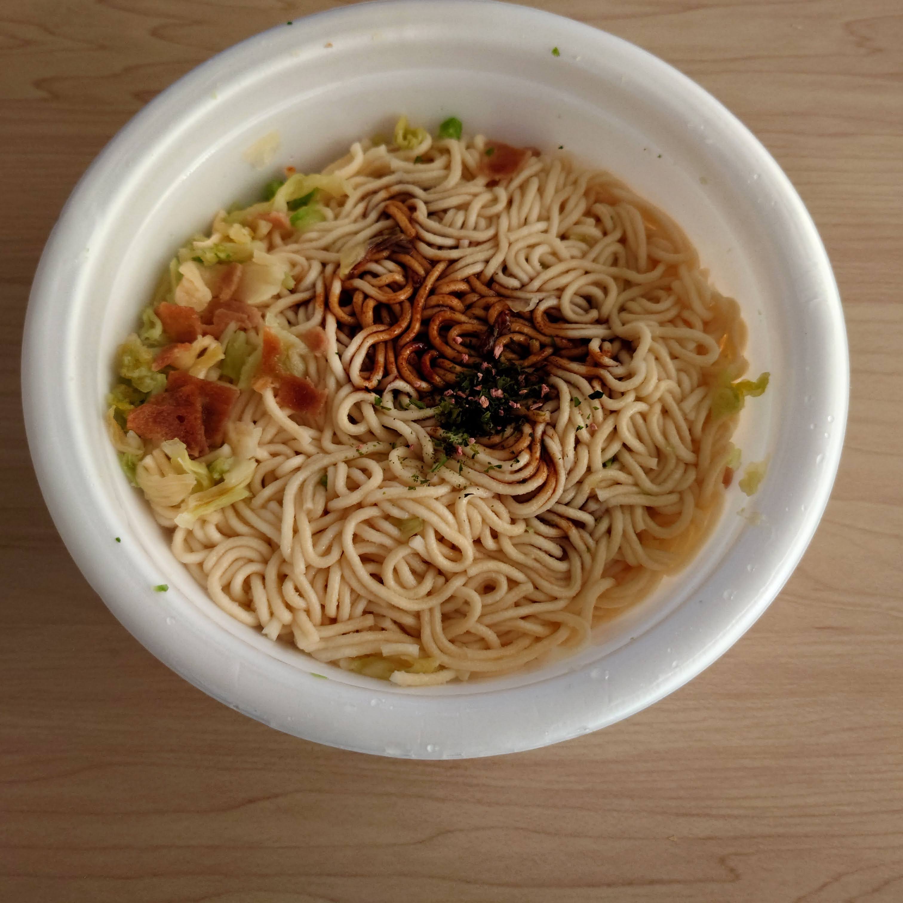 면이 익은 뒤 믈을 버리고 액체스프와 조미유, 후리카케를 뿌린 모습.