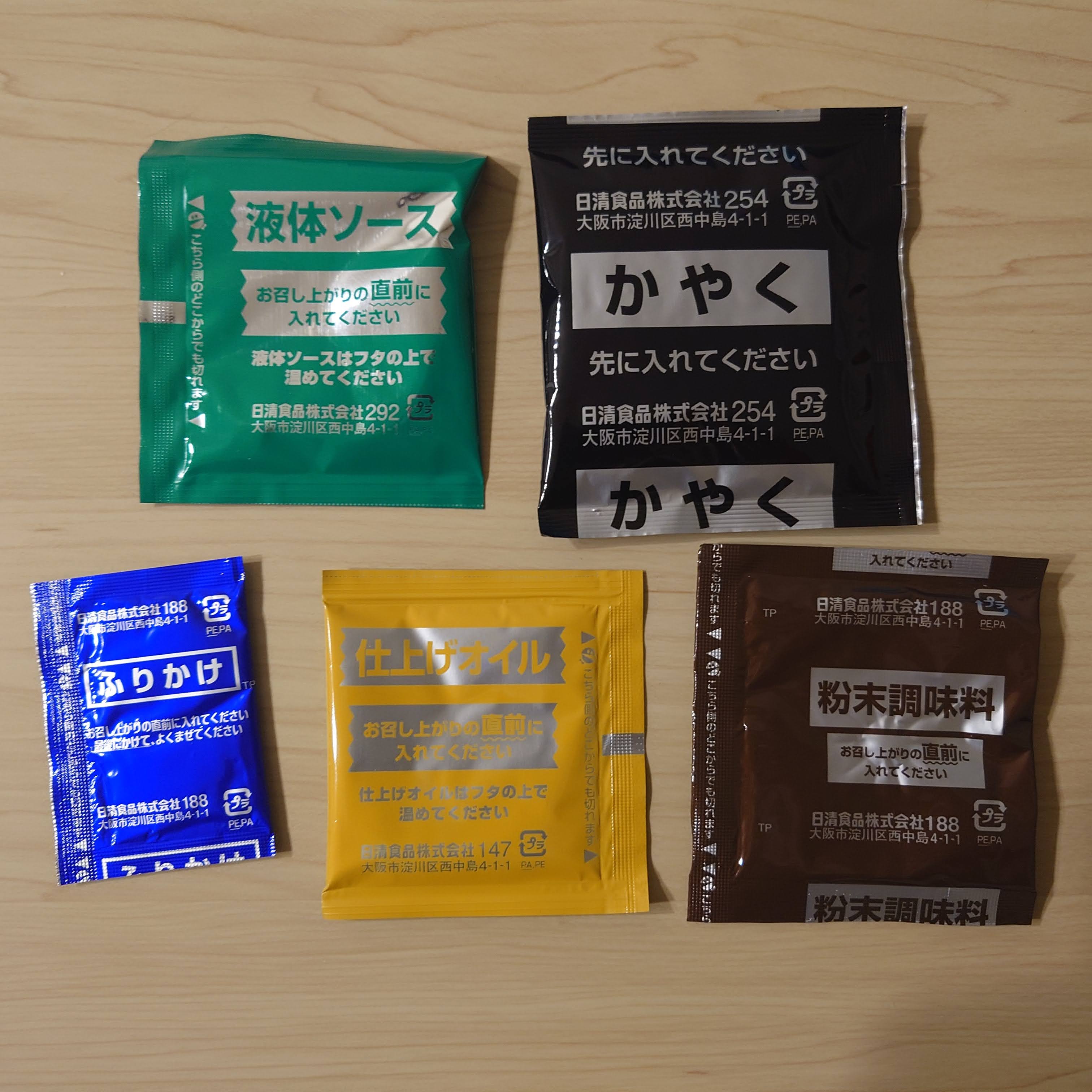 순서대로 배열하려고 하니, 왼쪽의 건더기 스프만 먼저 넣고 나머지 4개는 전부 면을 익힌 뒤에 넣으라고 되어 있었다. 초록색 액체스프는 노란색 조미유는 그릇 위에 올려서 데워먹어야 한다.