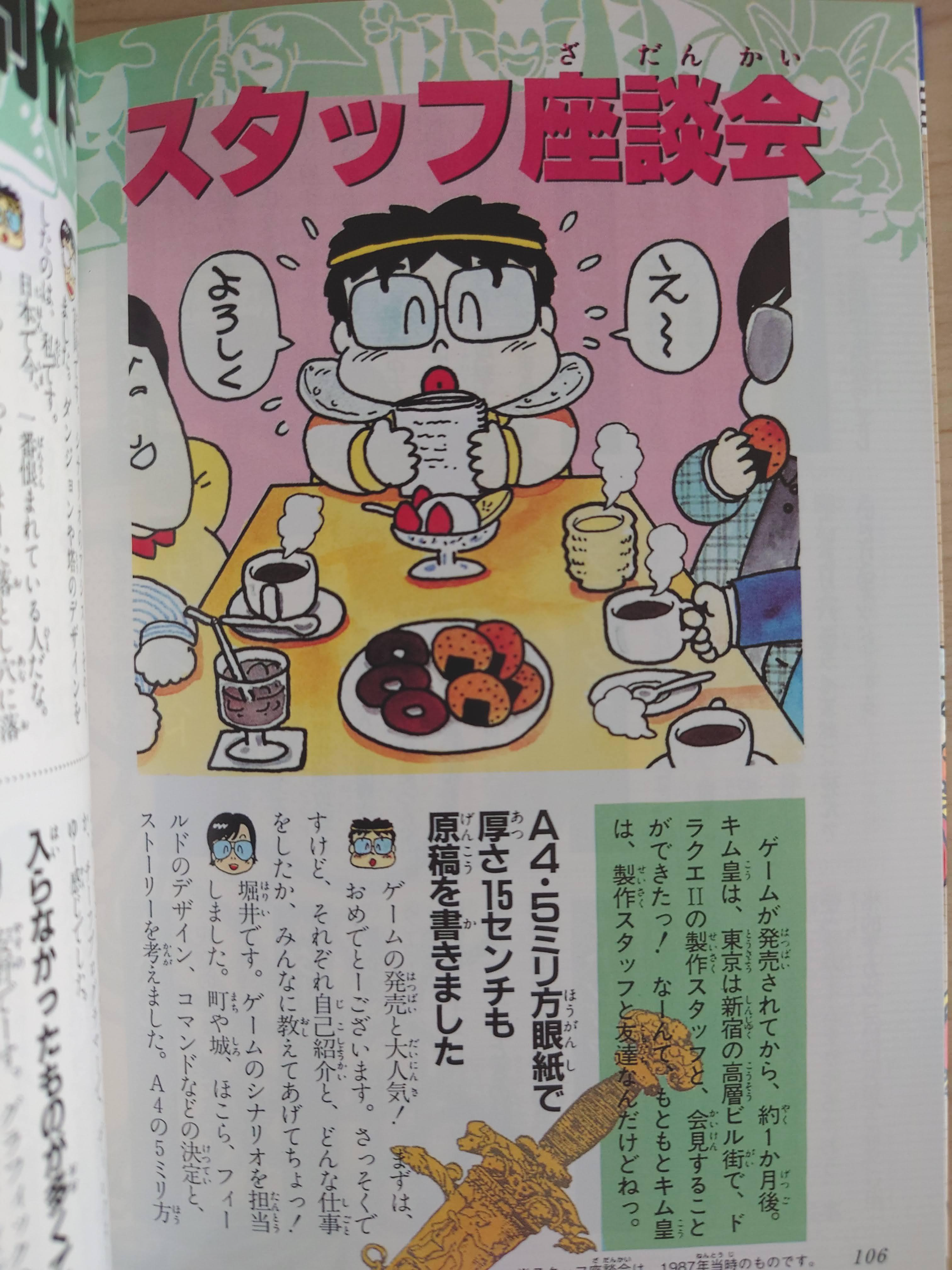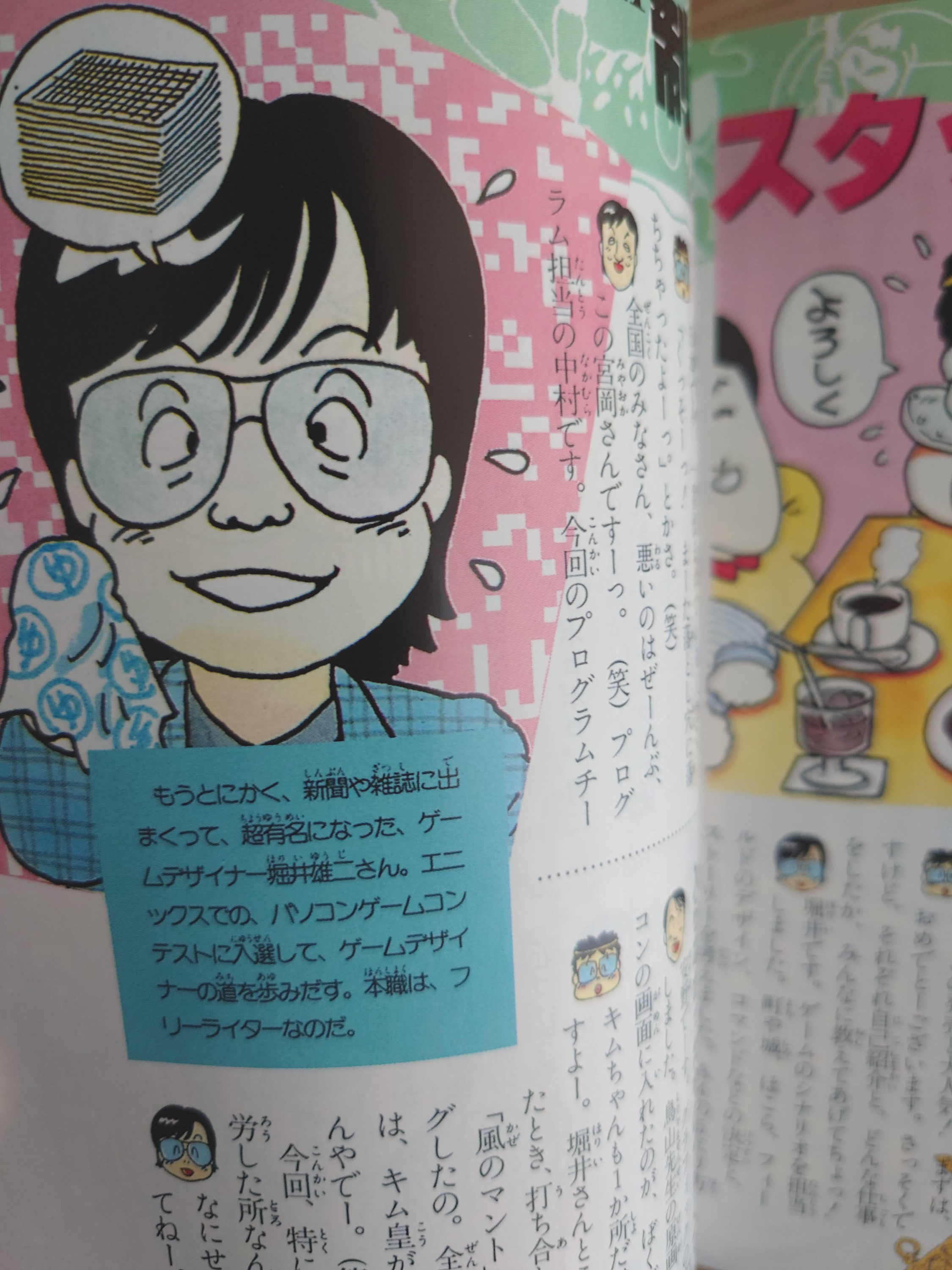 드래곤 퀘스트의 아버지 호리이 유우지(堀井雄二). 이 때부터 항상 '게임 디자이너' 라고 본인을 칭하고 있었다. 본래는 프리라이터였다가 컴퓨터에 관심을 가졌고, 에닉스에서 주최한 PC게임 컨테스트에 출품한 것을 계기로 게임 디자이너가 되었다고.