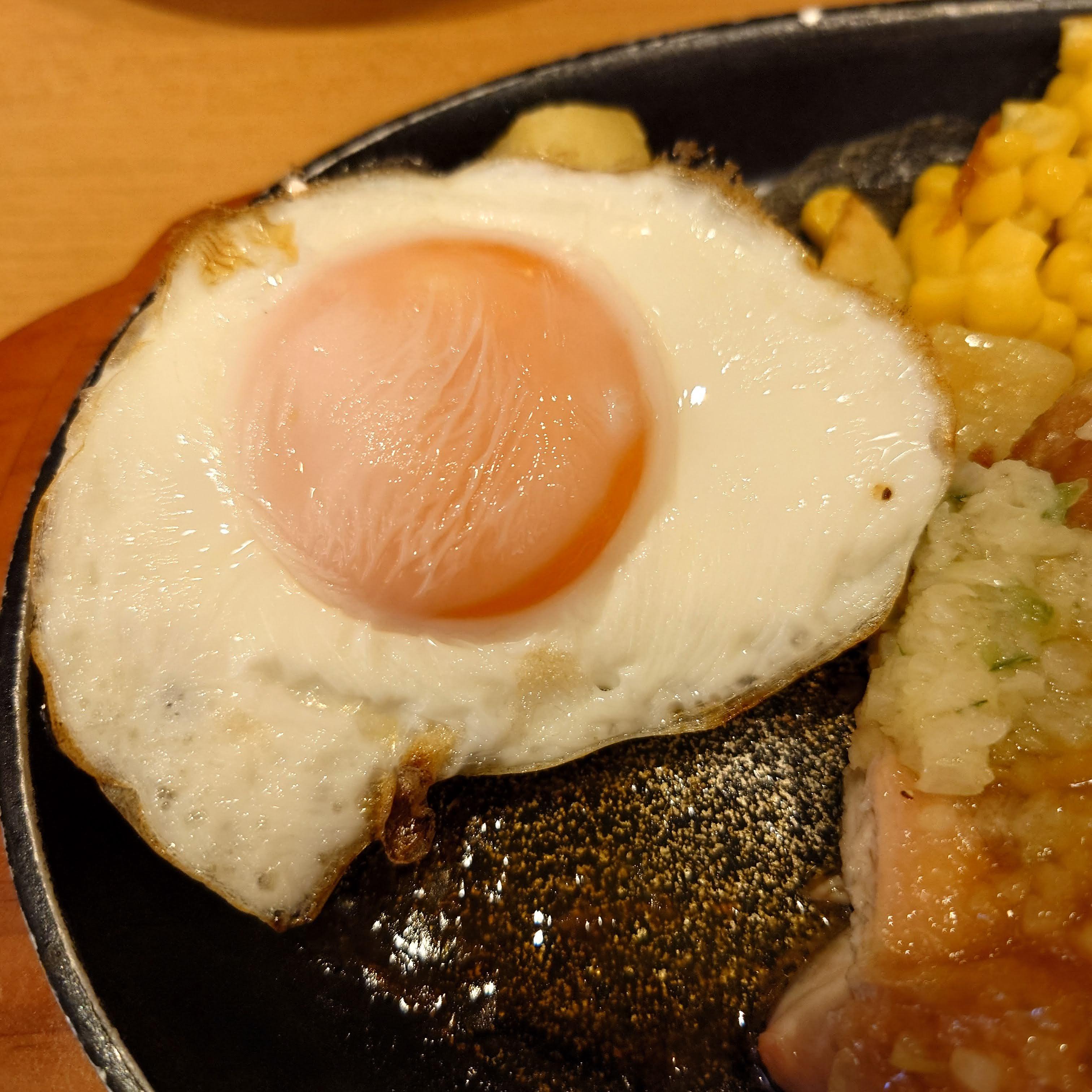 함바그 스테이크. (400엔) 달걀 후라이도 번듯하게 올라가 있다.