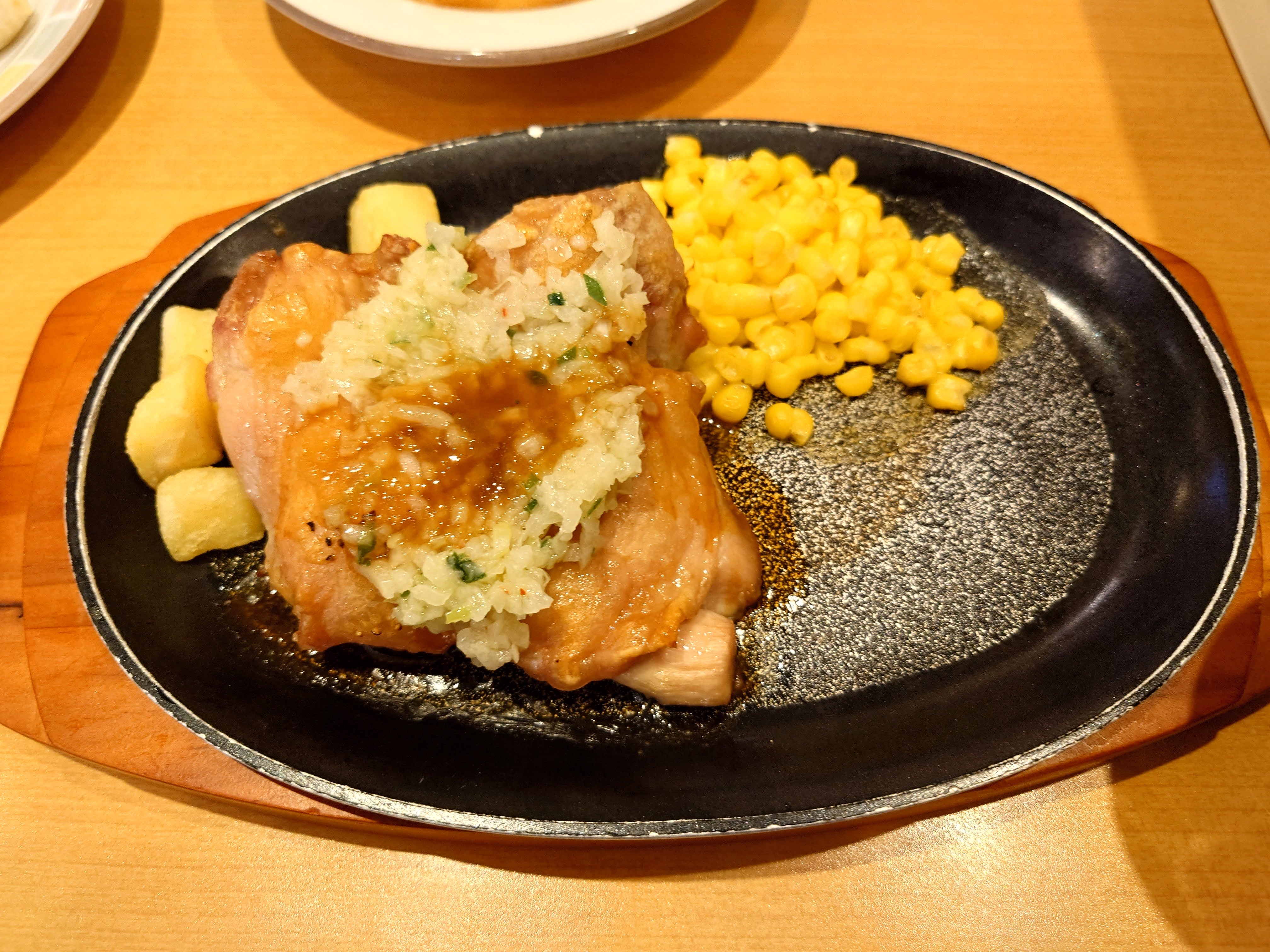 닭고기 디아볼라풍 소스 구이(500엔). 닭고기는 보기보다 훨씬 두껍고, 곁들여진 감자와 옥수수까지 먹으면 그냥 이걸로 한 끼가 될 정도.