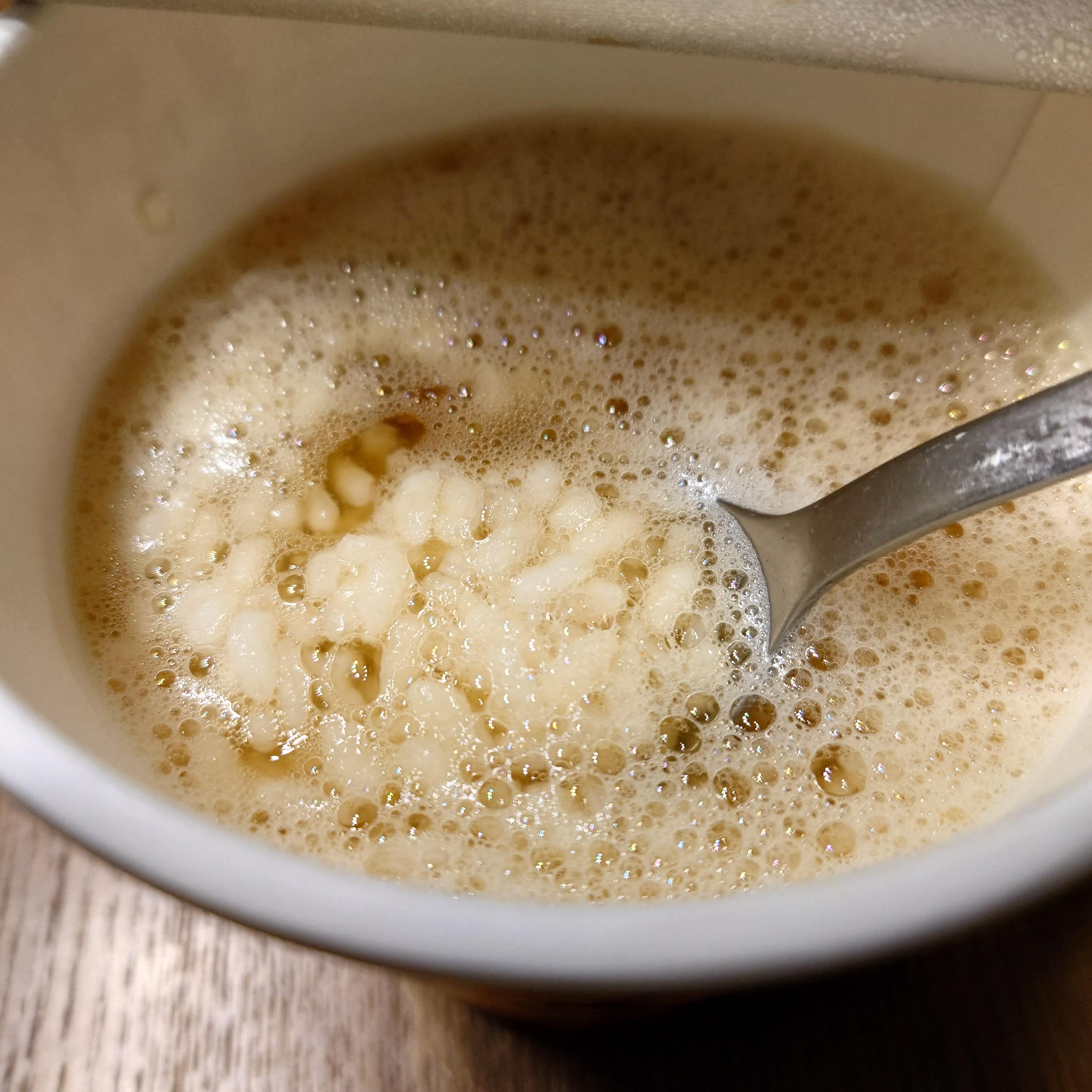 5분이 경과한 뒤, 숟가락으로 살짝 퍼올려 밥알이 충분히 익었는지 살펴본다. 딱딱하지도 않고 흐물흐물하지도 않은, 딱 좋은 밥알이 완성됐다.