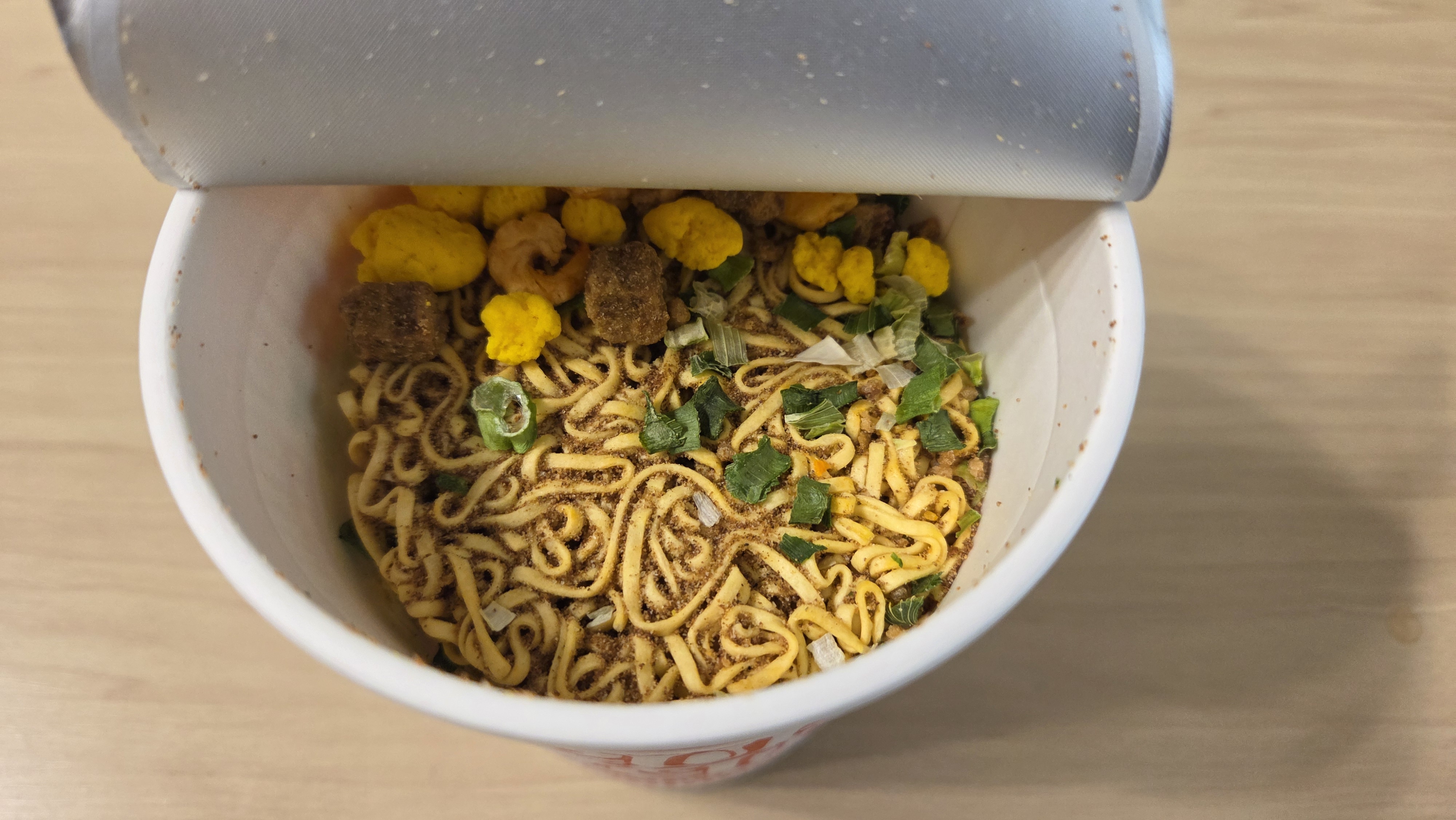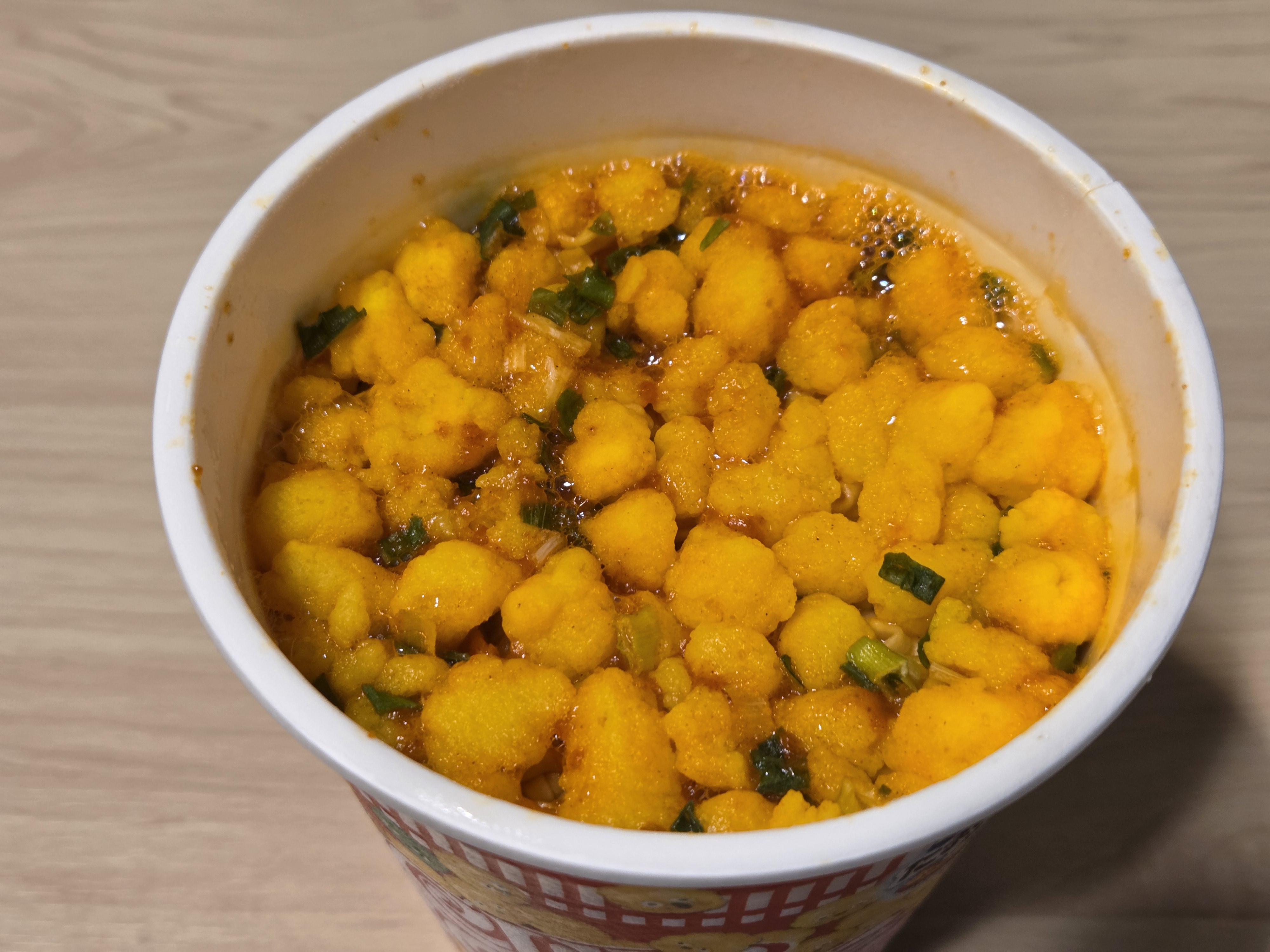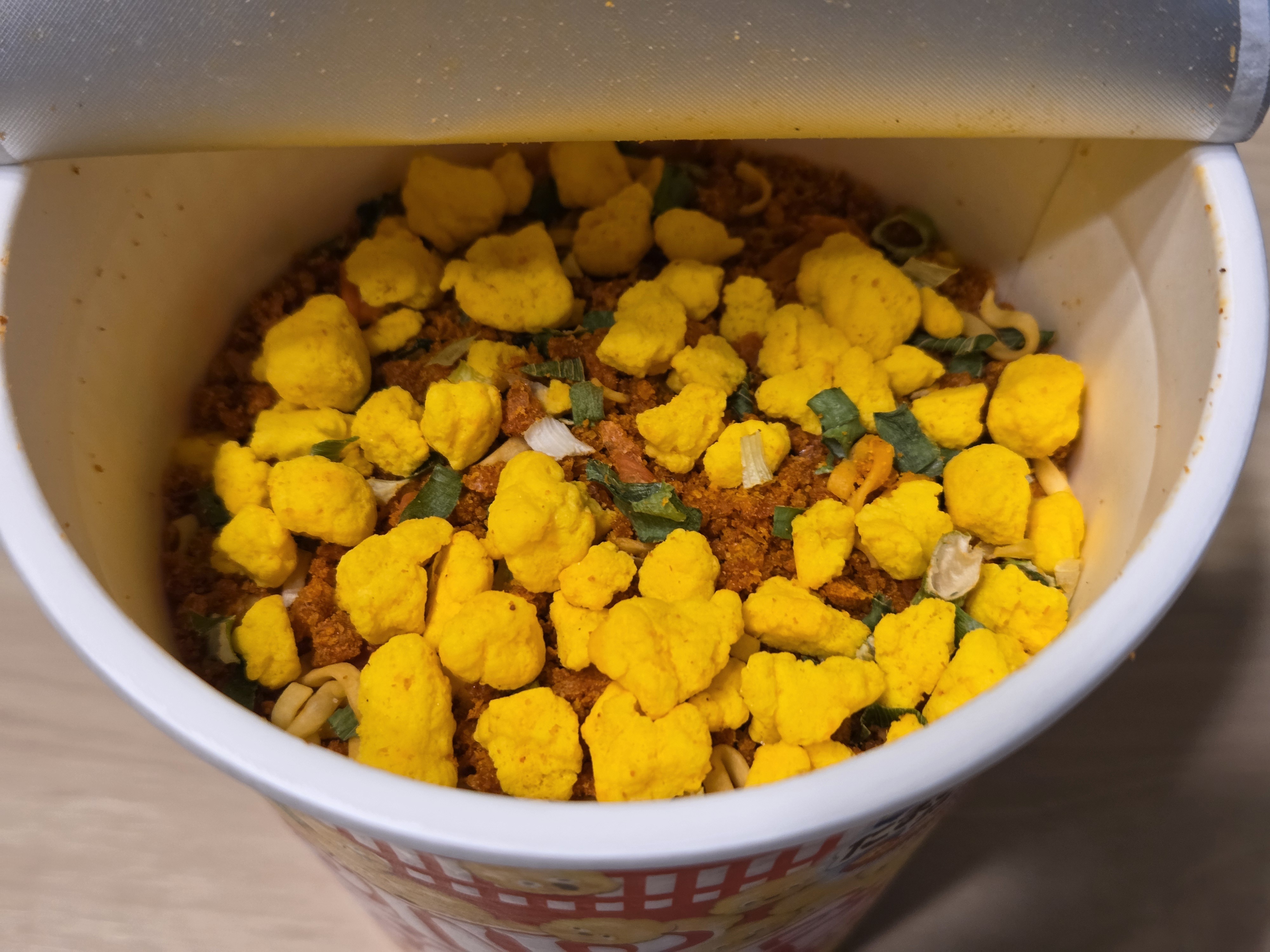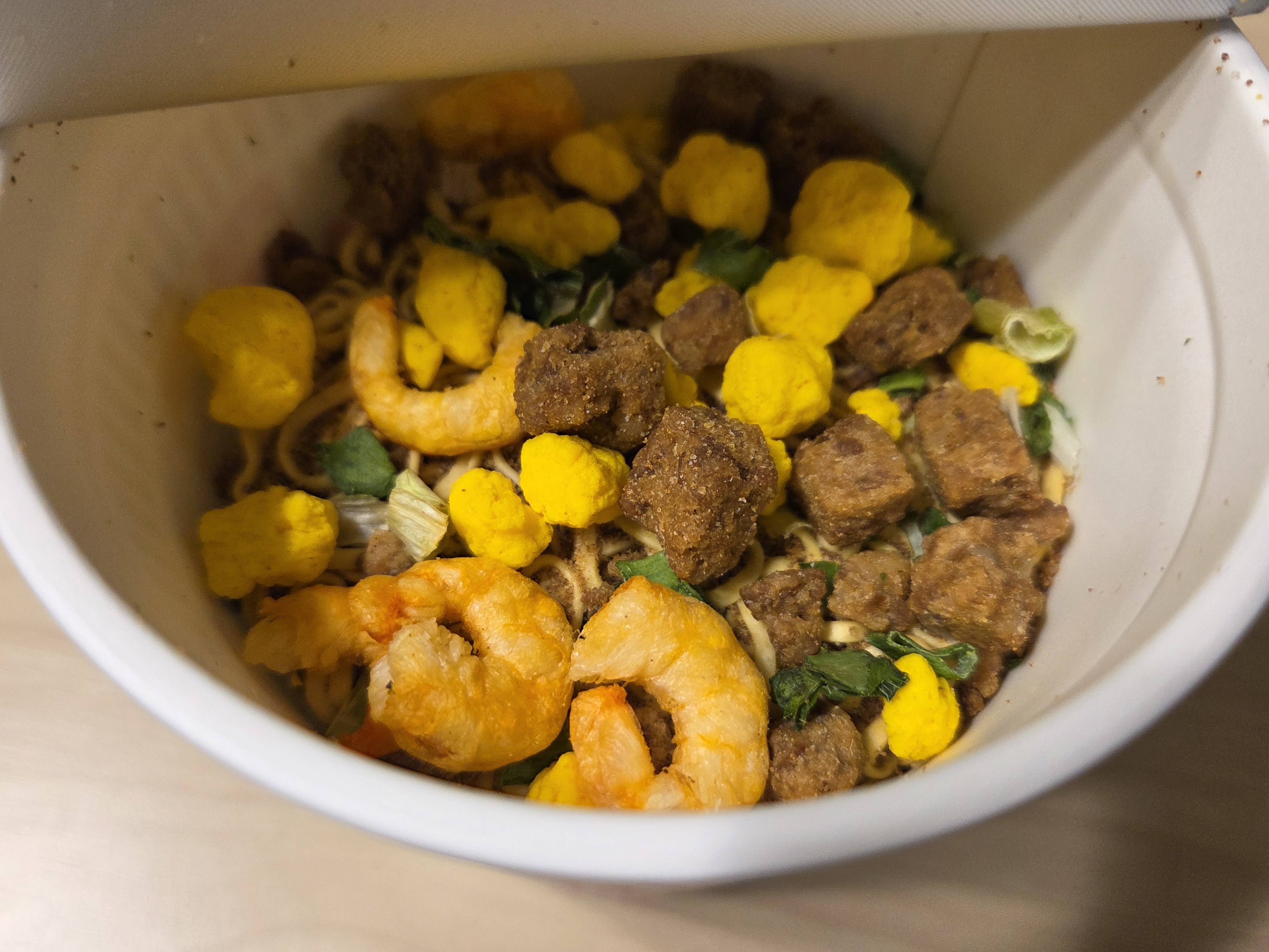 일반판 시푸드 컵누들에도 이 정도로 계란 건데기가 들어 있다. 여기서 콩고기와 새우를 죄다 계란으로 치환하고 더욱 양을 불린 버전을 생각했으니.. 아무래도 기대가 너무 컸나 보다. 계란 건더기가 사실은 단가가 제일 높았던 걸까?